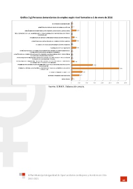 Gráfico 3.g) Personas demandantes de empleo según nivel formativo a 1 de enero de 2016 Fuente: SERVEF. Elaboración propia. II Plan Municipal de Igualdad de Oportunidades de Mujeres y Hombres de Elda 2017-2021 50