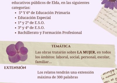 La temática de los relatos, que tendrá una extensión máxima de 300 palabras, versará sobre la mujer en todos los ámbitos: laboral, social, personal, escolar, familiar…