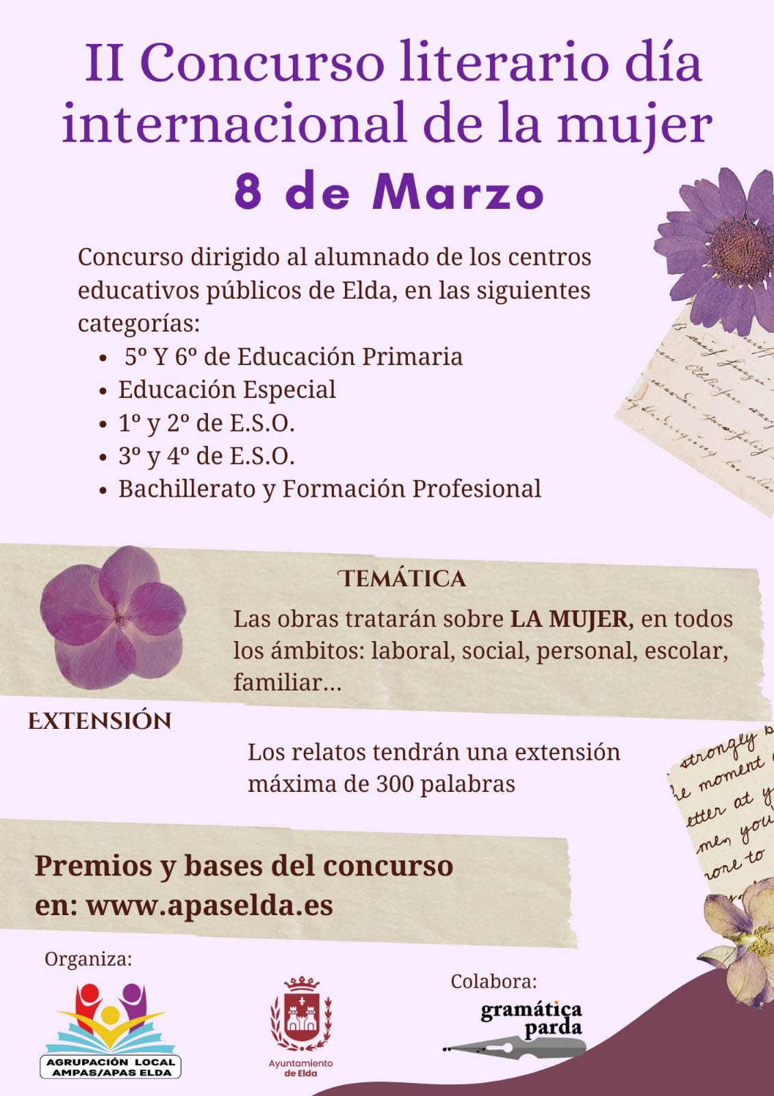 Gramática Parda colabora un año más en este certamen, que cuenta con cinco categorías en todos los niveles educativos y que tiene a la mujer en sus diferentes facetas como eje temático