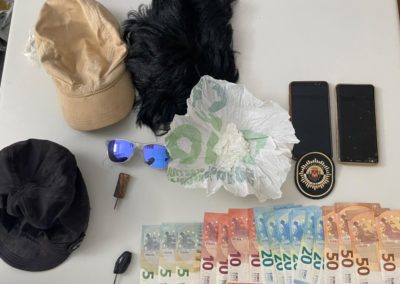 Durante el registro del vehículo, los agentes hallaron, entre otros objetos, una peluca, dos teléfonos móviles, dos gorras, dos objetos punzantes, una mochila con varios juegos de llaves y una cartera que contenía 395 euros en billetes. Tras comprobar que la bolsa contenía 27 gramos de sustancia estupefaciente, el individuo fue detenido y trasladado a la Comisaría de la Policía Nacional de Elda-Petrer.