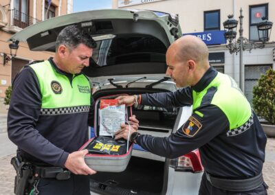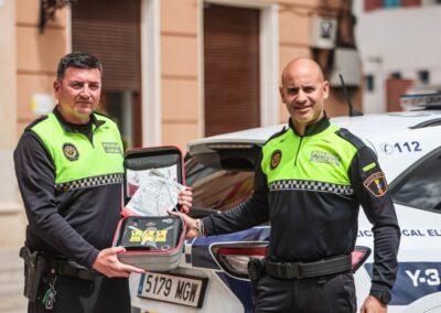 Los agentes desplazados al lugar de los hechos, que llegaron inmediatamente al estar de patrulla en la zona, se encontraron en una furgoneta a un hombre inconsciente, totalmente cianótico y en parada cardiorrespiratoria, por lo que uno de ellos procedió a realizarle las maniobras de reanimación cardiopulmonar, al tiempo que uno de sus compañeros preparaba el desfibrilador con el que están equipados los coches patrulla de la Policía Local de Elda.