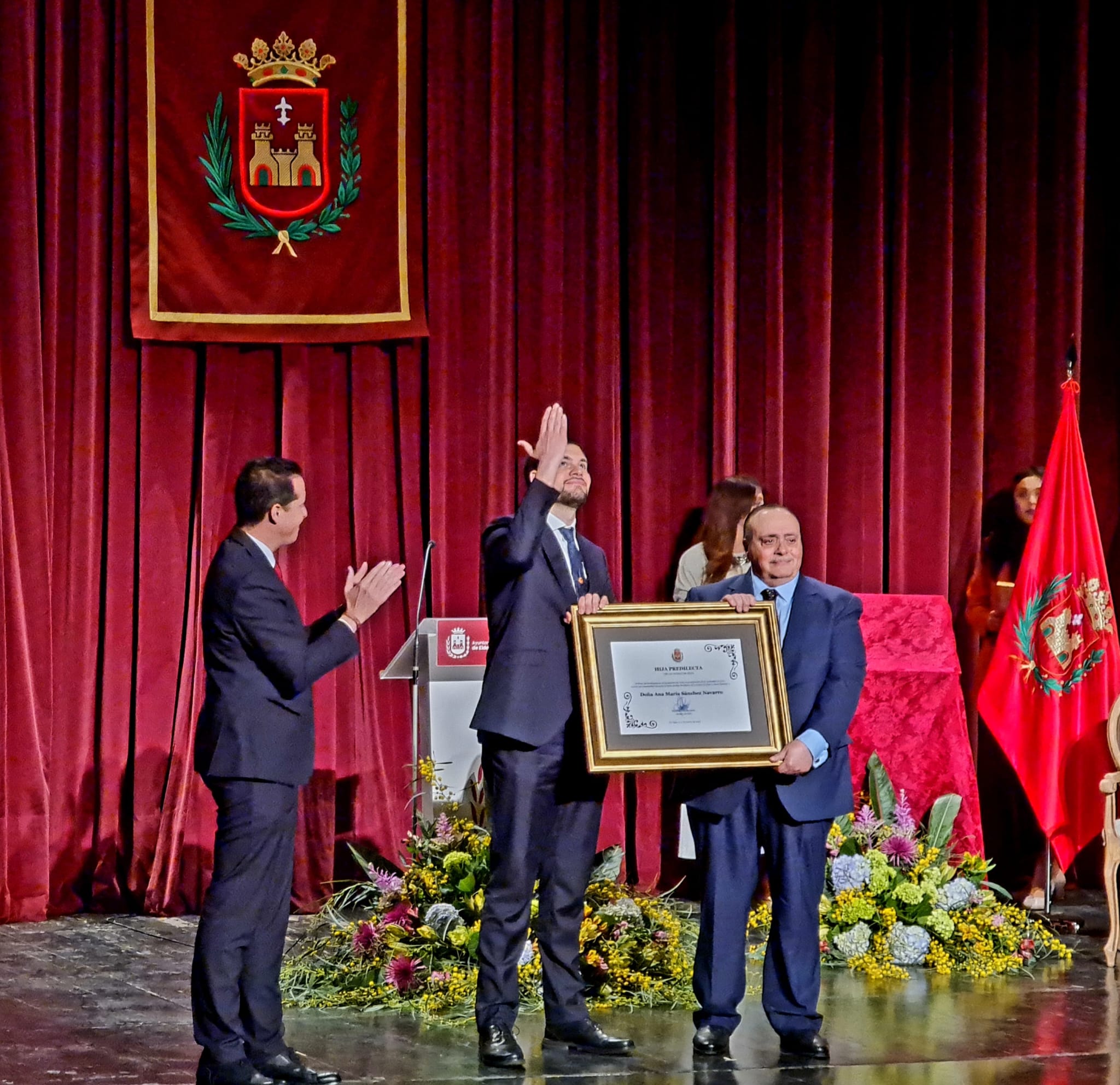 Seguidamente, en uno de los momentos más emotivos del acto, el alcalde de Elda, Rubén Alfaro, ha entregado a José Francisco Rubio y a su hijo Miguel Ángel Rubio el título acreditativo del nombramiento de Ana María Sánchez como Hija Predilecta de Elda.