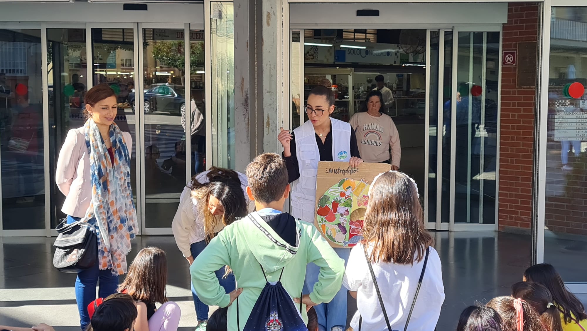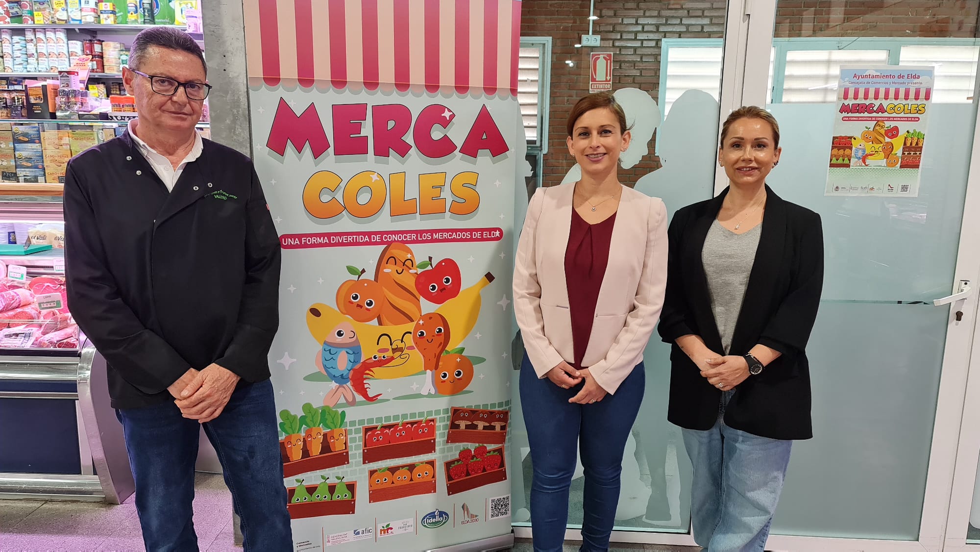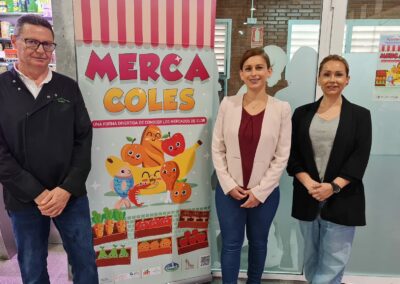 Silvia Ibáñez, acompañada por el presidente de la Asociación de Comerciantes del Mercado de San Francisco, Antonio Valero, y de Chari García, representante de la empresa Idella que organiza las visitas, ha afirmado que «Mercacoles es una actividad consolidada pero seguimos potenciándola porque consideramos que es fundamental que los niños y niñas de Elda visiten los mercados municipales y conozcan los productos de proximidad».