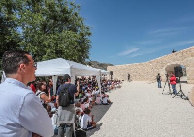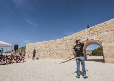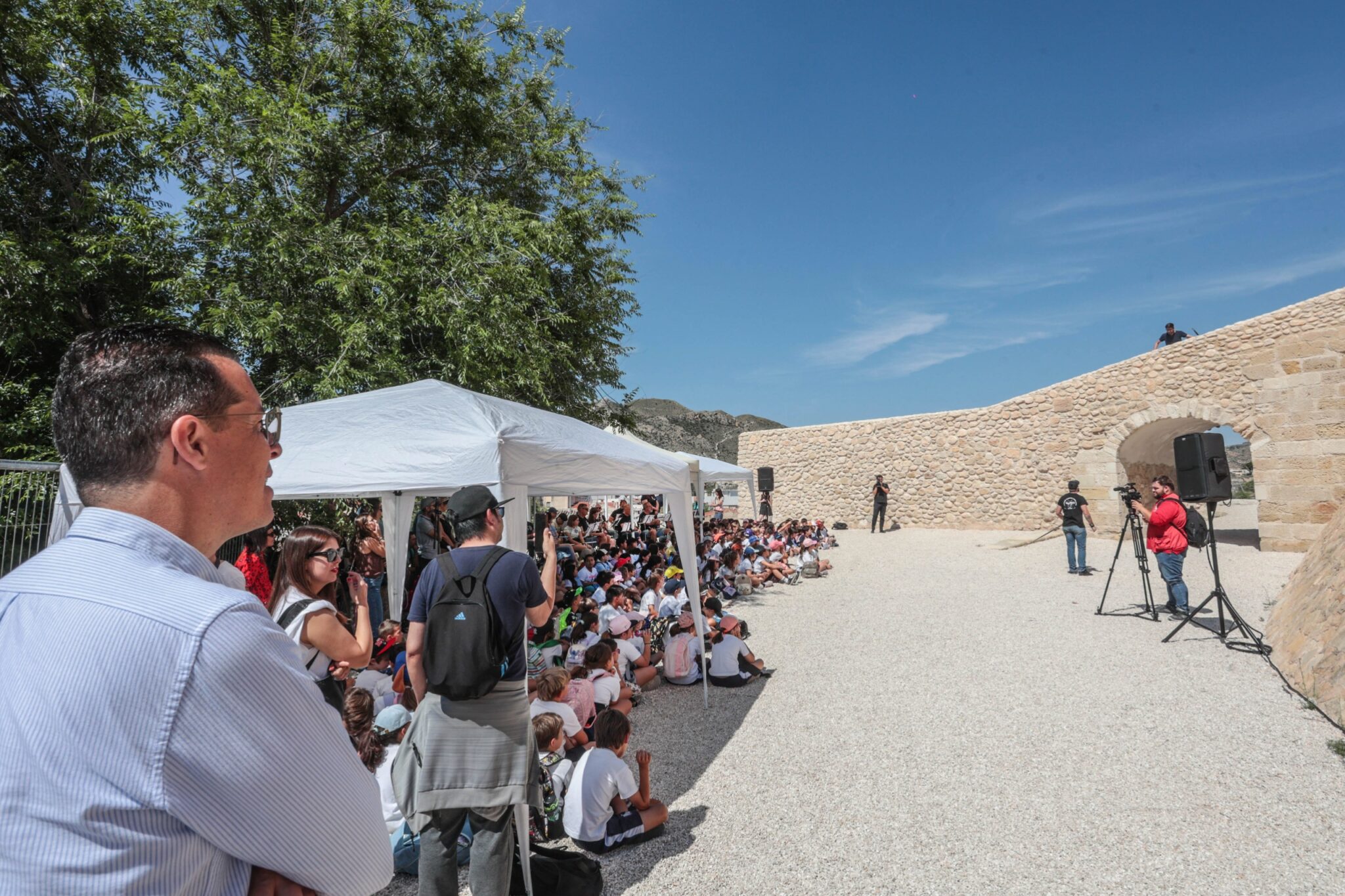 Más de 450 escolares de varios centros educativos de Elda han podido disfrutar esta mañana de una recreación de la lucha entre los embajadores moro y cristiano, uno de los momentos álgidos de las fiestas de Moros y Cristianos de Elda. La representación se ha realizado en el recinto del Palacio Condal de la ciudad, donde los niños y niñas han disfrutado también de la música de la AMCE Santa Cecilia.