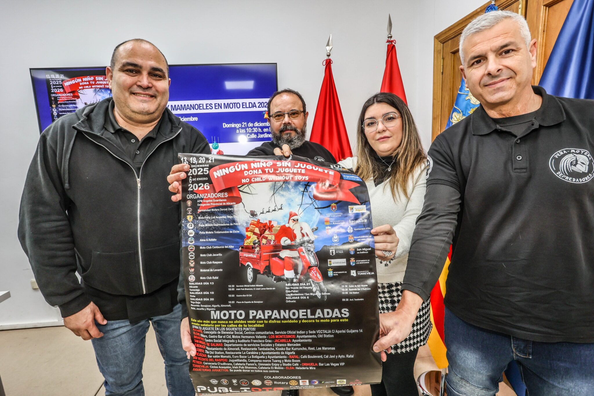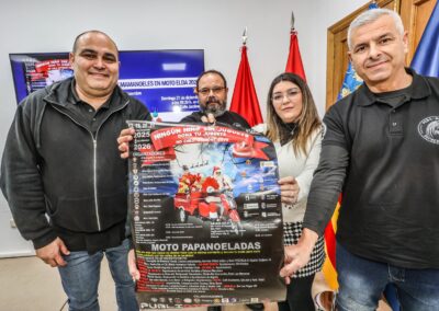 La concejala de Solidaridad, Anabel García, y de los representantes de Depredadores, Vicente García y Javier González, han dado a conocer los detalles de una iniciativa que se celebrará los días 20 y 21 de diciembre bajo el lema ‘Papa y Mamanoeles en moto. Elda 2025’. El objetivo es recoger juguetes para los niños y niñas cuyas familias carecen de recursos.