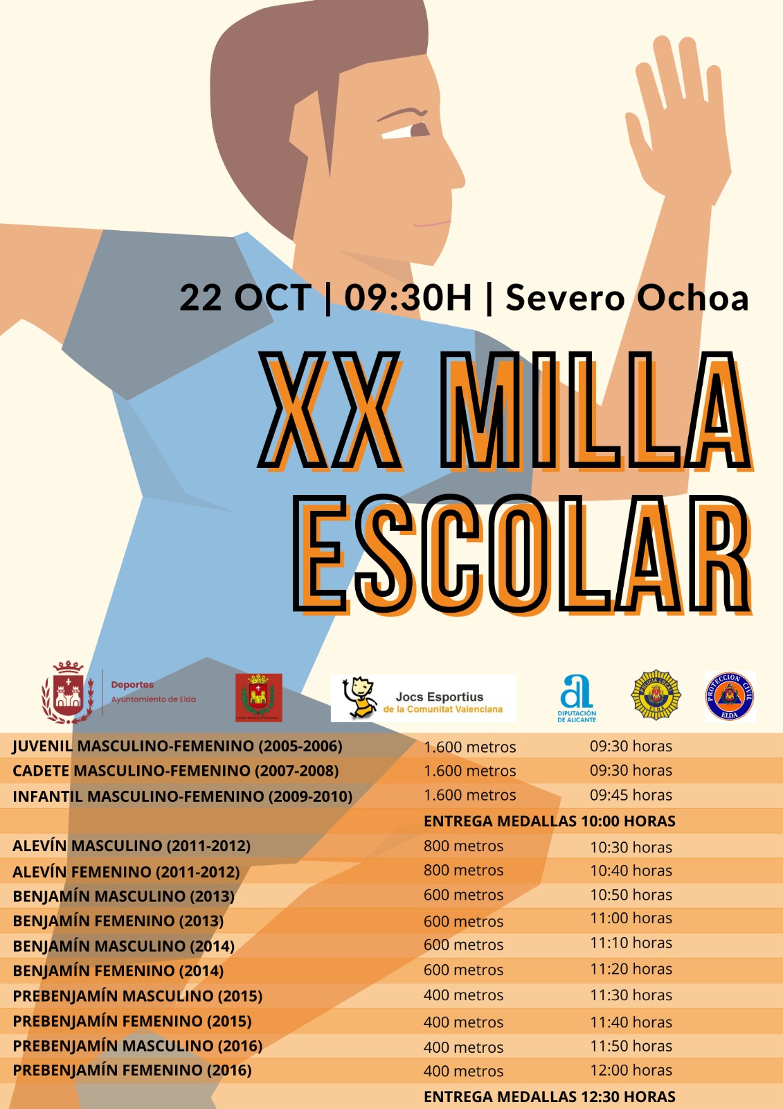 El próximo sábado, a partir de las 9.30 horas, se celebra en la Avenida de Ronda la XX Milla Escolar de Elda, una prueba que da el pistoletazo de salida a la fase local de los Juegos Deportivos de la Comunidad Valenciana.