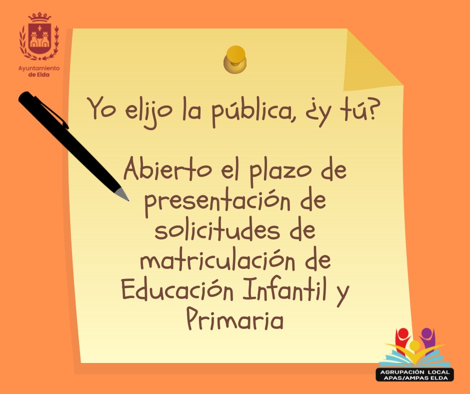 Hoy ha comenzado el periodo de matriculación en los centros educativos eldenses para el curso 2022-23 con la apertura del plazo de admisión telemática para alumnos de Educación Infantil y Primaria. Este periodo continuará hasta el 4 de mayo, mientras que en FP la admisión será del 19 al 29 de mayo y en ESO y Bachillerato del 26 de mayo al 3 de junio.