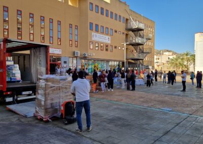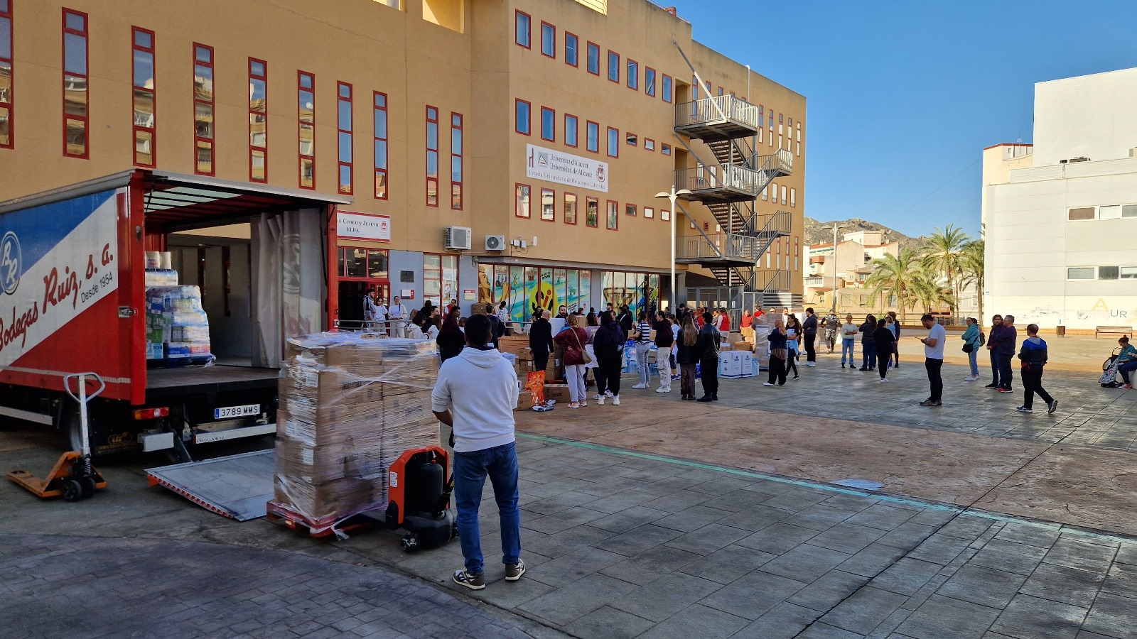 Las cajas han sido depositadas en la Plaza de la Ficia para ser cargadas en dos camiones y una furgoneta, que se han encargado de realizar el traslado de toda la mercancía. Los vehículos han sido aportados de manera desinteresada por Bodegas Ruiz, Cliché Audiovisuales, Estantelda y Karma. Además, la empresa Big Mat Busquier también ha ofrecido un camión cisterna para transportar agua no potable en las próximas horas y otro camión para realizar el transporte de material cuando sea necesario.