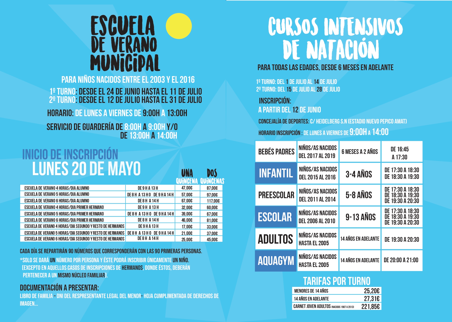 El plazo de inscripción para la escuela de verano comienza el 20 de mayo y se ofertarán alrededor de 600 plazas, por otra parte, el plazo de inscripción para los cursos intensivos de natación se abre el 12 de junio
