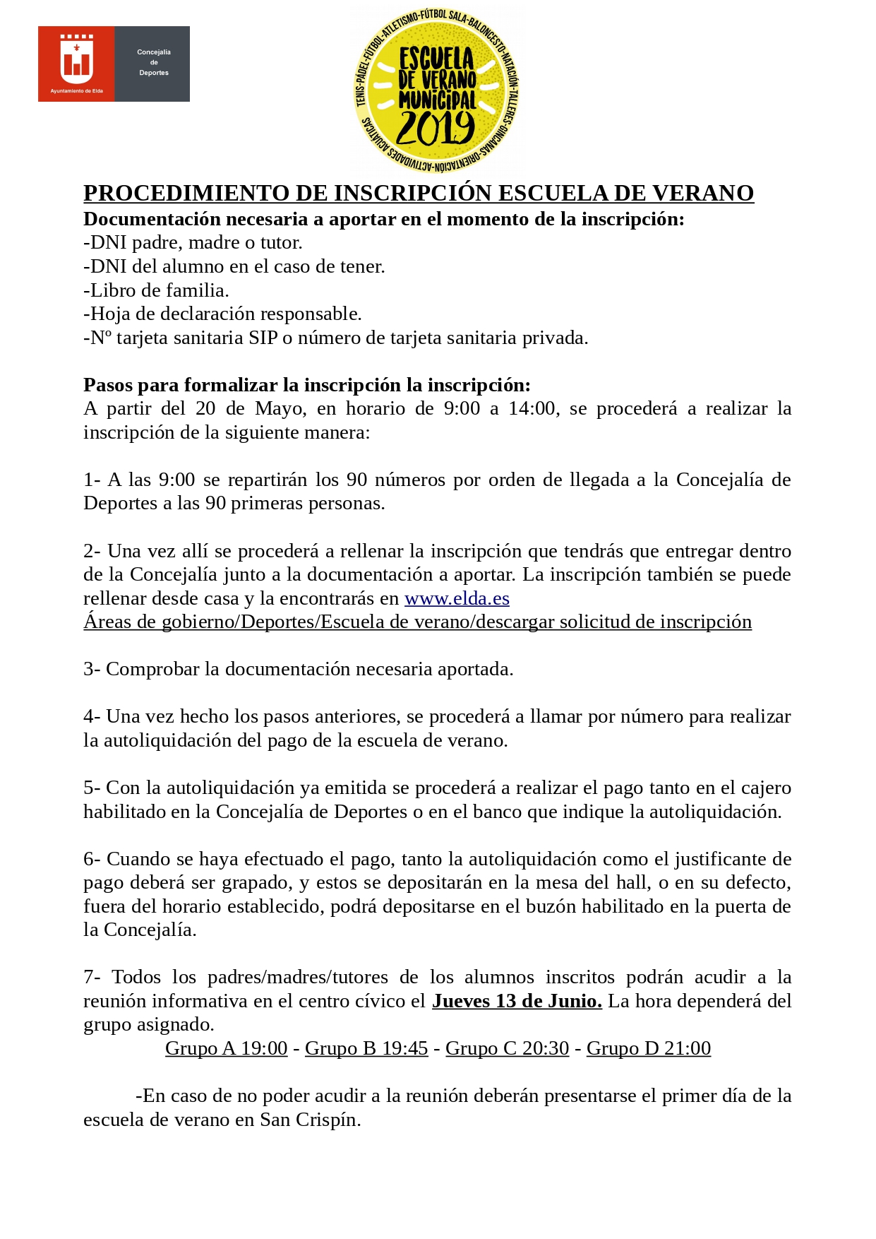 La inscripción para la Escuela de Verano comenzará el día 20 de mayo, en concejalía de Deportes (C/ Heidelberg s/n (Estadio Nuevo Pepico Amat). Para distribuir las plazas, cada día se repartirán 90 números que se corresponderán con las 90 primeras personas. Se dará un número por persona y con éste se podrá inscribir únicamente a un niño o niña, excepto en los casos de hermanos pertenecientes a un mismo núcleo familiar. Además, deberán presentar el libro de familia, el DNI del representante legal del menor y la hoja cumplimentada de derechos de imagen. Una vez realizado este proceso, para todos los inscritos, se celebrará en 13 de junio una reunión informativa en el Centro Cívico (Plaza de la Ficia, Avenida de Chapí, 36).