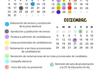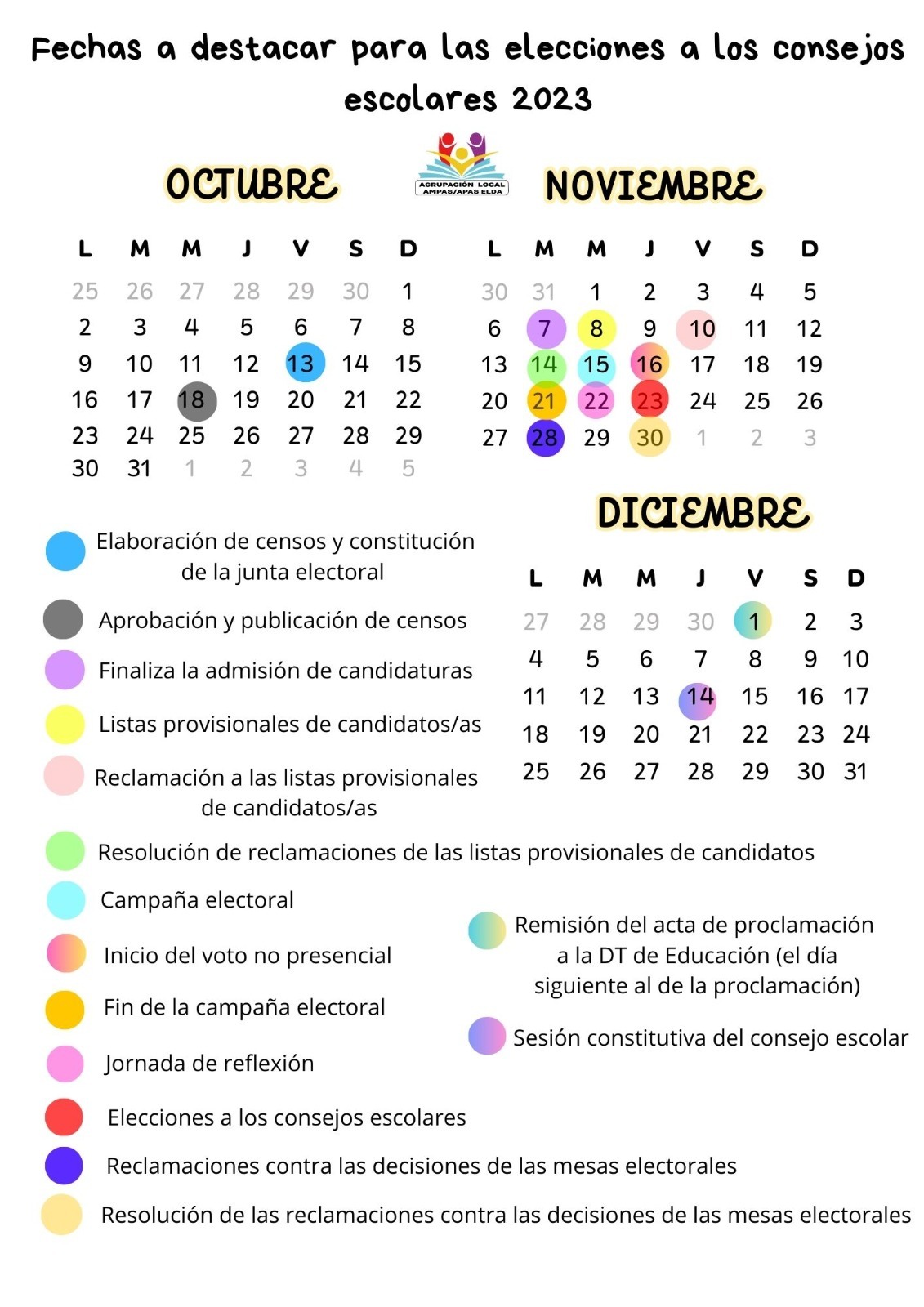 El calendario arranca con la exposición del censo de votantes, ya que en este proceso electoral están convocados todas las madres y padres cuyos hijos e hijas cursen estudios en cualquier centro educativo. En segundo lugar se anima a madres y padres a formar parte de las candidaturas de las AMPAS y a continuación se prepara la propaganda electoral de las candidaturas de las ampas. Y por último, desde las Ampas se informa de una parte muy importante para la participación en este proceso electoral como es el voto no presencial.