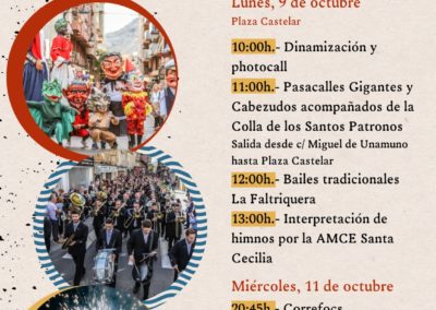 La edil ha explicado que «durante la mañana del lunes 9 de octubre se realizará un pasacalles que dará comienzo a las 11.00 horas y que contará con la presencia del grupo la Colla de Gigantes y Cabezudos acompañados de la Colla Santos Patronos y el grupo de danza La Faltriquera. El pasacalles comenzará en la sede de la Colla de Gigantes y Cabezudos, sita en la calle Miguel de Unamuno, y continuará con un recorrido que realizará una parada en la Plaza Mayor, sobre las 11.30 horas, y finalizará en la Plaza Castelar sobre las 12.00 horas, donde actuará el grupo La Faltriquera».