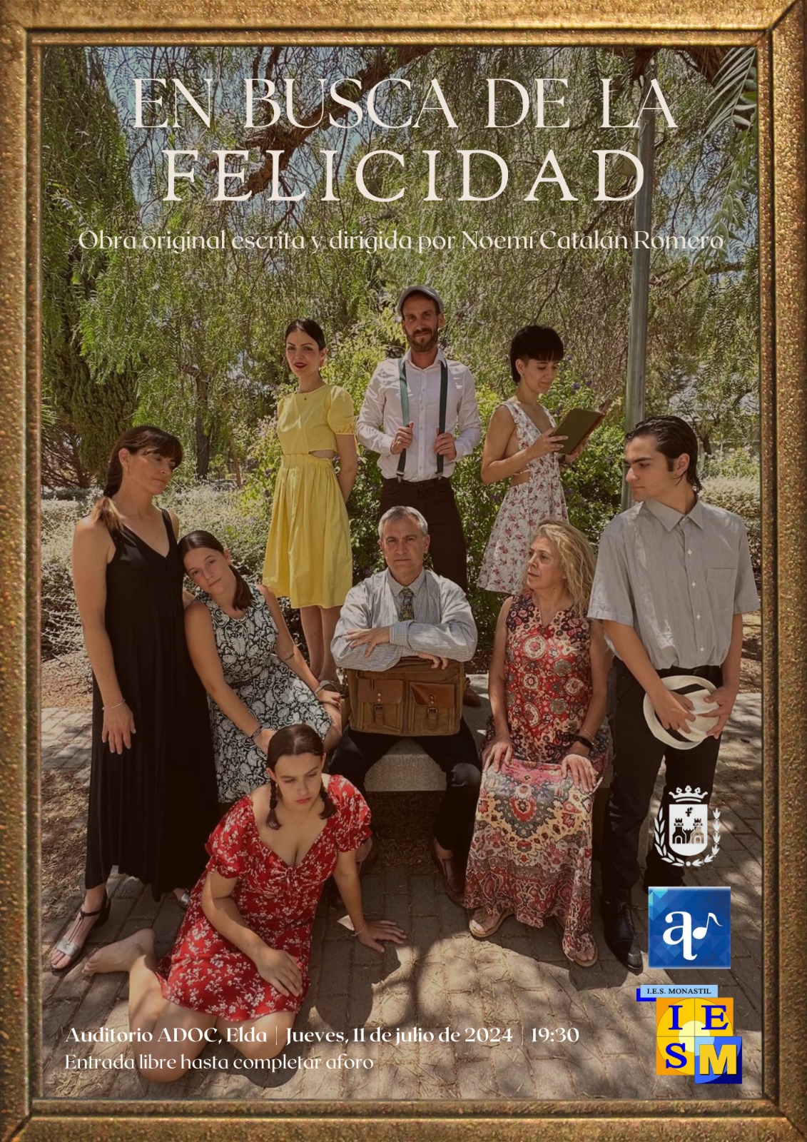 La comunidad educativa del IES Monastil representará la obra teatral ‘En busca de la felicidad’ el próximo jueves, 11 de julio, a las 19.30 horas en el Auditorio ADOC. “La obra supone un viaje por la emoción. Con trasfondo histórico es, sin duda, una pieza teatral singular, radicando parte de su peculiaridad en ser una obra original, escrita, dirigida e interpretada por alrededor de cincuenta miembros de la comunidad educativa del IES Monastil, sin experiencia artística: profesorado, alumnado, familiares. Personajes creados con pinceladas biográficas de cada uno de ellos”, ha explicado la guionista, directora y profesora, Noemí Catalán.