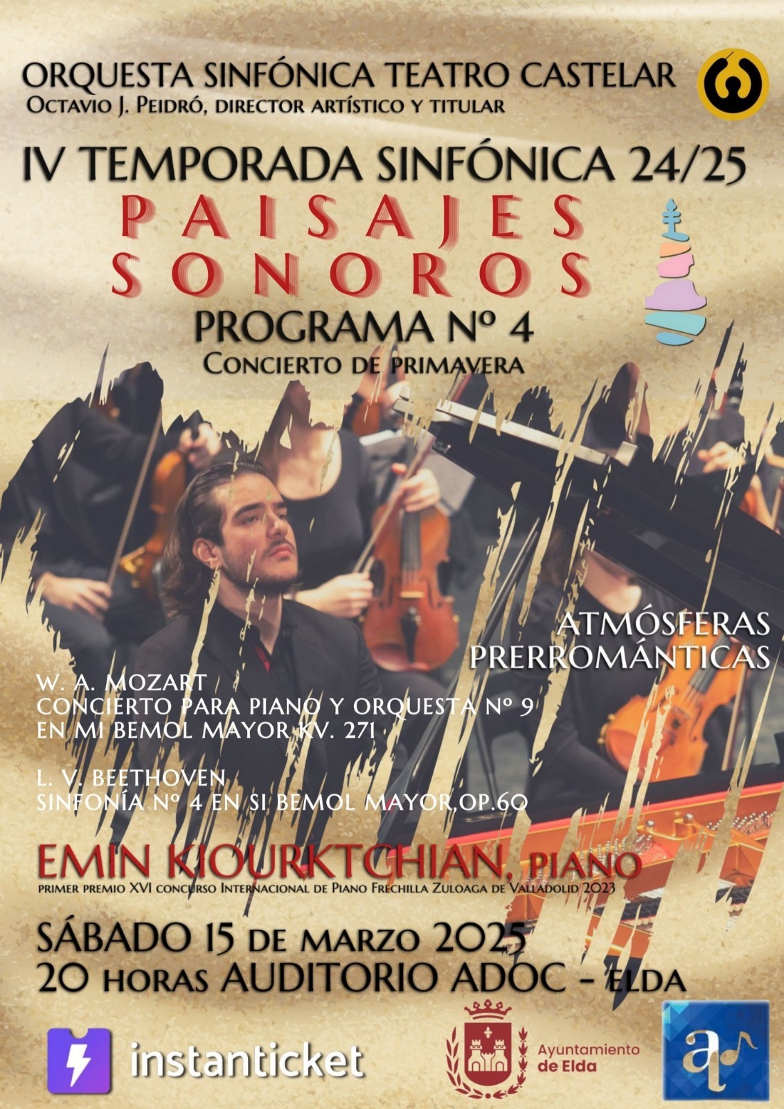 El próximo 15 de marzo, a las 20:00 horas, el Auditorio ADOC de Elda será el escenario de un nuevo concierto dentro de la IV Temporada Sinfónica de la Orquesta Sinfónica del Teatro Castelar. Bajo la dirección de Octavio J. Peidró, la agrupación interpretará el Programa Nº 4 ‘Atmósferas Prerrománticas’, con obras de Mozart y Beethoven. El concierto contará con la participación del joven pianista Emin Kiourktchian, de 20 años, quien interpretará el Concierto para piano y orquesta Nº 9 en mi bemol mayor KV 271 de W. A. Mozart.