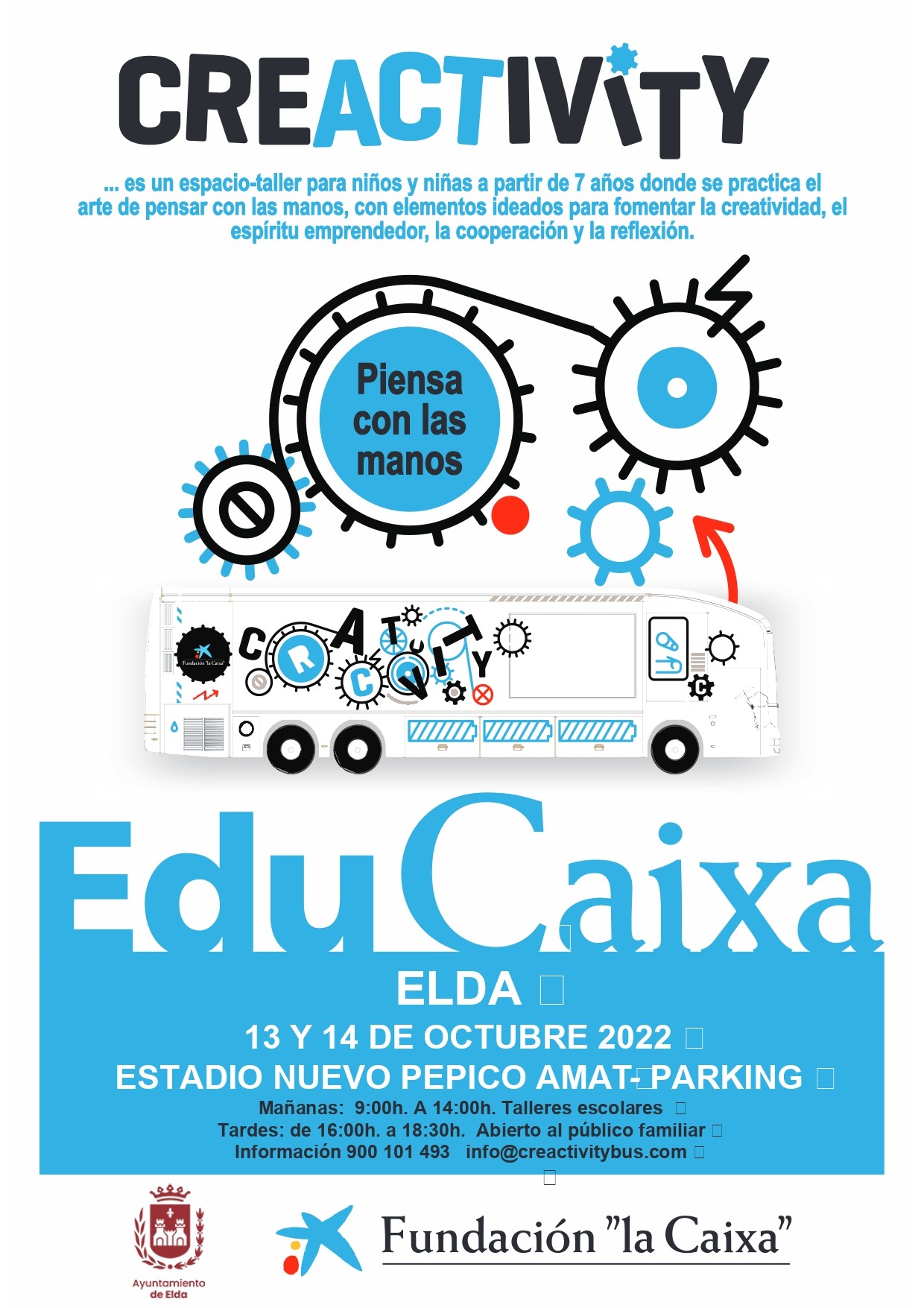 El autobús itinerante ‘Creactivity’ visita esta semana Elda y hará parada en el aparcamiento del Nuevo Pepico Amat. En concreto, se ubicará los días 13 y 14 de octubre, de 9.00 a 14.00 horas y de 16.00 a 18.30 horas, en una actividad impulsada desde la Concejalía de Educación. Por las mañana se realizarán talleres escolares y por las tardes estará abierto al público familiar.