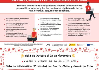 La concejala de Juventud, Anabel Garcia, ha recordado que «este tipo de talleres permiten facilitar formación en competencias digitales, impulsan la innovación social y el empoderamiento de la ciudadanía gracias al uso de la tecnología El objetivo principal de los talleres, que además tienen carácter gratuito, es la adquisición competencias digitales a la ciudadanía de forma cercana, sencilla, práctica y gratuita, contribuyendo de esta manera a reducir la brecha digital en las y los eldenses».