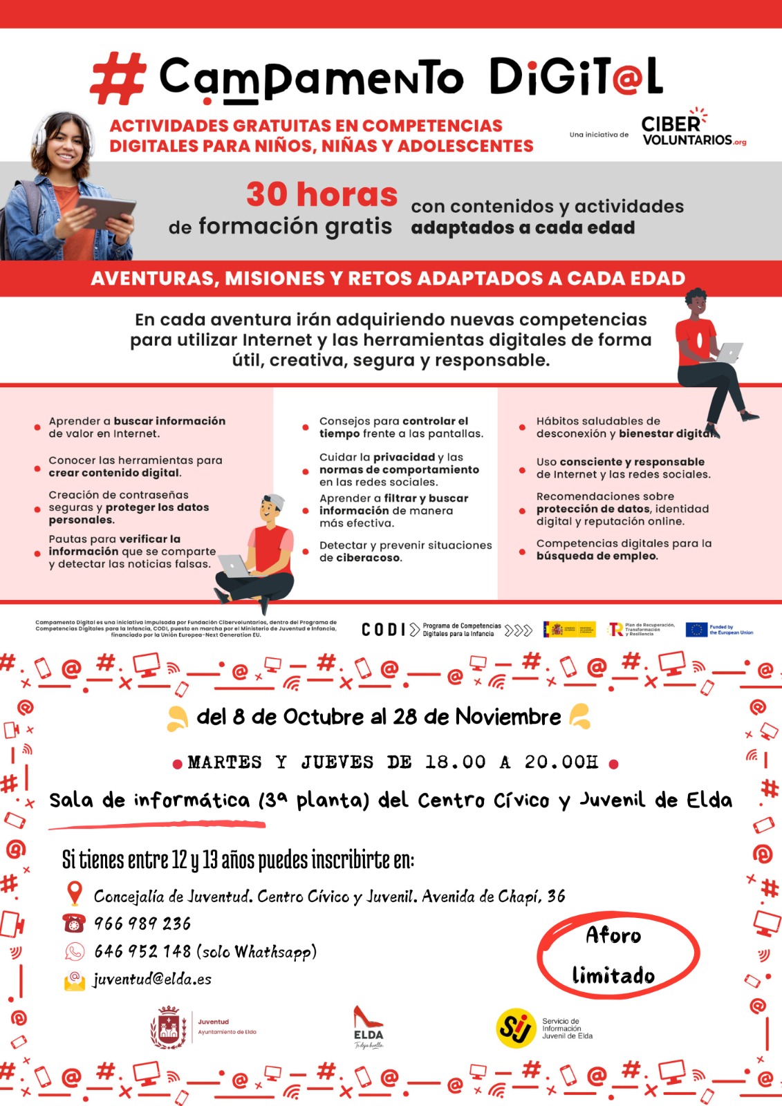 El Ayuntamiento de Elda, a través de la Concejalía de Juventud, ha abierto el plazo de inscripción para participar en el Campamento Digital y en los talleres de Ciberformaciones TIC y Conectados. Se trata de actividades de carácter gratuito que se desarrollarán en las instalaciones del Centro Cívico y Juvenil.