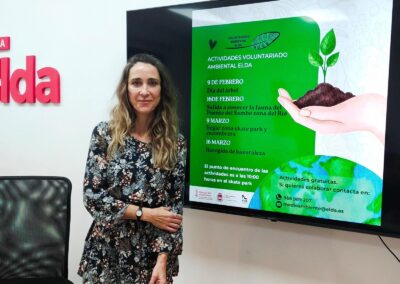 El Ayuntamiento de Elda, a través de la Concejalía de Medio Ambiente, ha anunciado hoy el programa trimestral de actividades del voluntariado ambiental. La concejala del área, Cristina Rodríguez, ha explicado esta mañana que la programación está diseñada para «fomentar la participación ciudadana en la conservación y mejora del entorno natural de la ciudad. Este calendario incluye una amplia variedad de iniciativas destinadas a sensibilizar, educar y actuar en favor del medio ambiente».