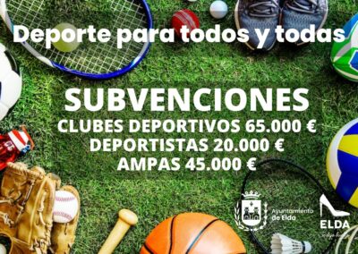 El presupuesto de estas subvenciones es de 130.000 euros, distribuidos de la siguiente manera: 60.000 euros, para los clubes deportivos, 45.000 euros para las AMPAS y 20.000 euros para los deportistas individuales. El edil ha recordado que «a esta cifra hay que añadir los convenios nominativos con el Centro Excursionista Eldense (50.000 euros) y el Club Deportivo Nueva Elda Fútbol Sala (18.000 euros)».