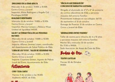 Por último, para culminar el Mes del Mayor, se celebrará un año más la gala de las Bodas de Oro, «un acto muy entrañable de homenaje a esas personas que han creado familias y que han permanecido toda una vida juntas. Desde aquí animo a todas aquellas familias cuyos mayores cumplan 50 años juntos se inscriban para participar en un evento que tendrá lugar el 25 de octubre, a las 19.00 horas en el Teatro Castelar», ha concluido David Guardiola.