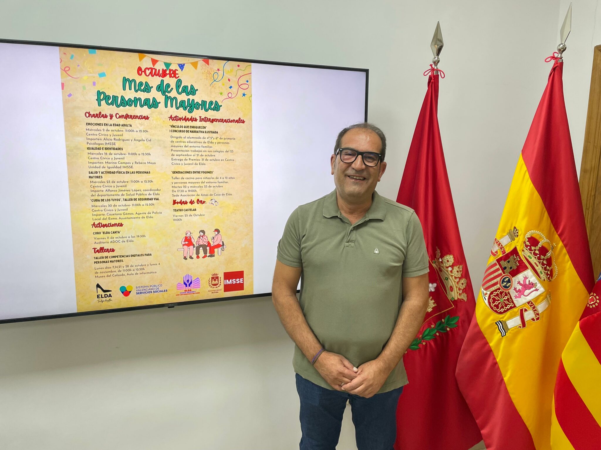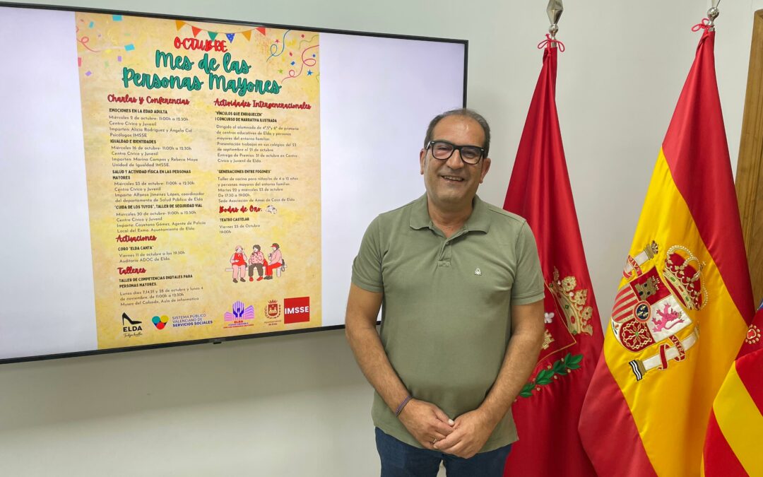 El concejal de Bienestar Social y Personas Mayores, David Guardiola, ha presentado esta mañana el calendario de propuestas y actividades de carácter gratuito y organizadas por el Ayuntamiento de Elda con motivo de la celebración del Mes del Mayor. El edil del área ha recordado que «un año más, desde el Ayuntamiento de Elda tenemos muy presentes a las personas mayores. Hemos preparado un mes pensando en ellos con varias actividades, como charlas, conferencias y talleres».