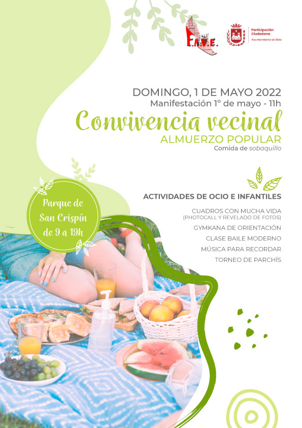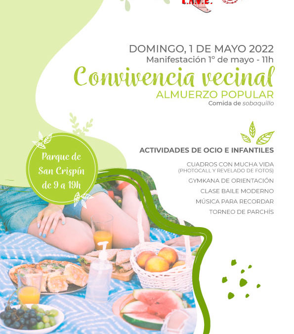 Por su parte, Antonio Cuenca ha indicado que “la jornada de convivencia, que incluye la celebración de un almuerzo popular con comida de sobaquillo, tendrá lugar de 9.00 a 19.00 horas en el Parque de San Crispín. Habrá actividades de ocio e infantiles, como una gincana de orientación, clases de baile moderno, actuación de un DJ, torneo de parchís, ‘photocall’, etcétera”.