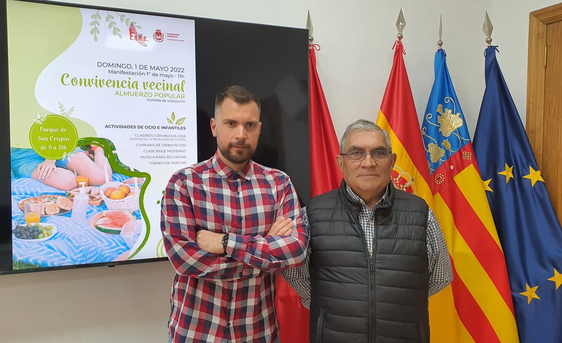 El Ayuntamiento de Elda, a través de la Concejalía de Participación Ciudadana, colabora en las actividades que con motivo de la celebración de 1 de Mayo organiza la Federación de Asociaciones de Vecinos de Elda (FAVE). El concejal de Participación Ciudadana, Javier Rivera, acompañado por el presidente de FAVE, Antonio Cuenca, ha explicado que “pensamos que es importante dar apoyo a actividades de convivencia vecinal que fomentan los valores de respeto, convivencia pacífica y sociedad democrática como los que hoy se presentan”.