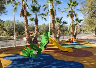De ese modo, todo el área infantil ha quedado abierta al público tras la renovación integral tanto de los juegos infantiles como del caucho amortiguador instalado sobre el pavimento, con un mayor espesor y de colores más vivos. La renovación también ha contado con la colocación de un nuevo tobogán, un muelle simple y uno múltiple para poder jugar tanto de manera autónoma como en compañía de otros niños, todos ellos con temática de animales y de diversos colores.
