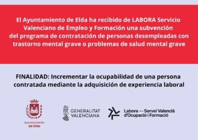 El Ayuntamiento de Elda, a través de la Concejalía de Recursos Humanos y en el marco del Programa ETRAME impulsado por la Generalitat Valenciana, ha realizado una contratación laboral temporal de una persona desempleada con problemas de salud mental grave, con la finalidad de que incremente su empleabilidad mediante la adquisición de experiencia laboral.