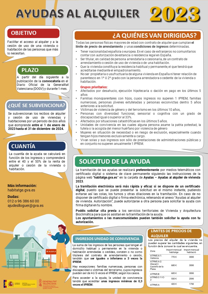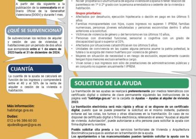 El pasado 20 de noviembre finalizó el periodo para solicitar la Ayuda al Alquiler 2023 de la Generalitat Valenciana. Hay que recordar que son subvencionables los recibos de alquiler y cesión de uso de viviendas y habitaciones de dos años. Las ayudas forman parte del Programa de Ayudas al Alquiler de Viviendas del Plan Estatal para el acceso a la vivienda 2022-2025.