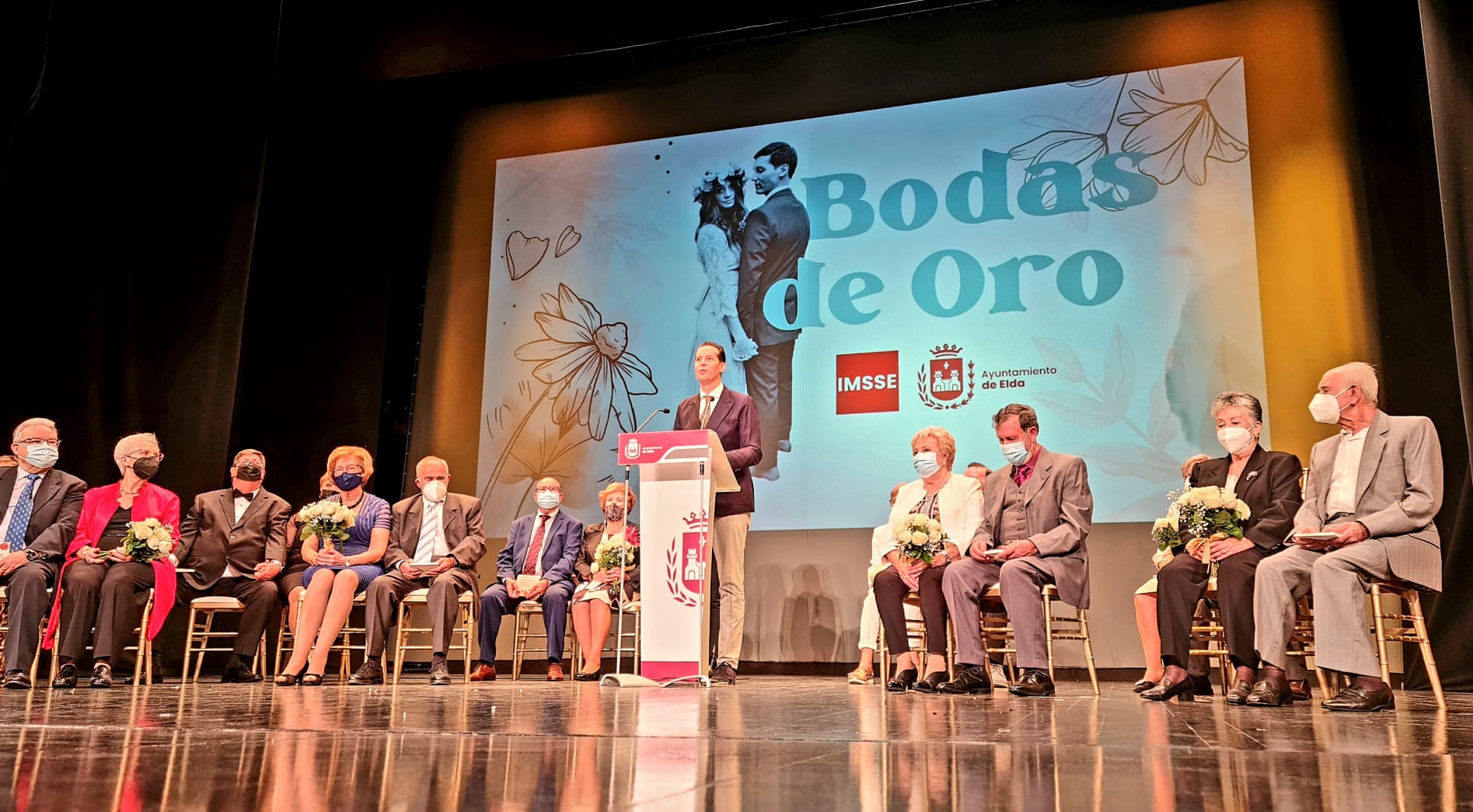 El acto lo ha cerrado el alcalde de Elda, Rubén Alfaro, con una intervención en la que ha afirmado que “hoy celebramos no sólo vuestras bodas, sino vuestras vidas, vuestro amor. Amores de toda una vida, vidas que quiso el destino que un día se cruzaran. Siendo un día feliz, no podemos olvidarnos de las parejas en las que falta uno de sus miembros por la pandemia”.