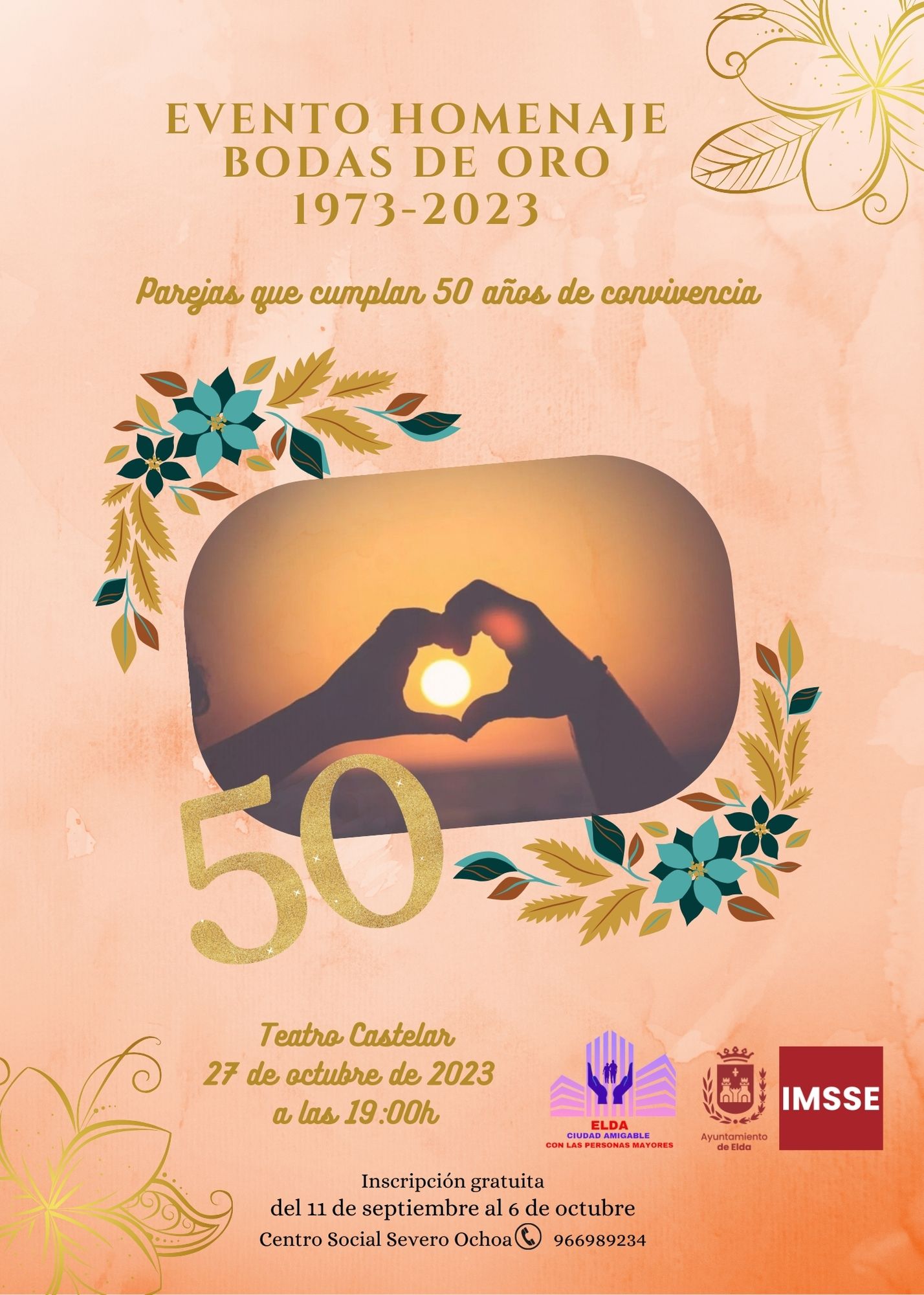 El Teatro Castelar acogerá el próximo 27 de octubre una nueva edición del evento ‘Bodas de Oro’, una celebración que dará comienzo a las 19.00 horas y en la que una vez más se rendirá homenaje a aquellas parejas empadronadas en Elda que durante el presente año celebran sus 50 años de matrimonio.