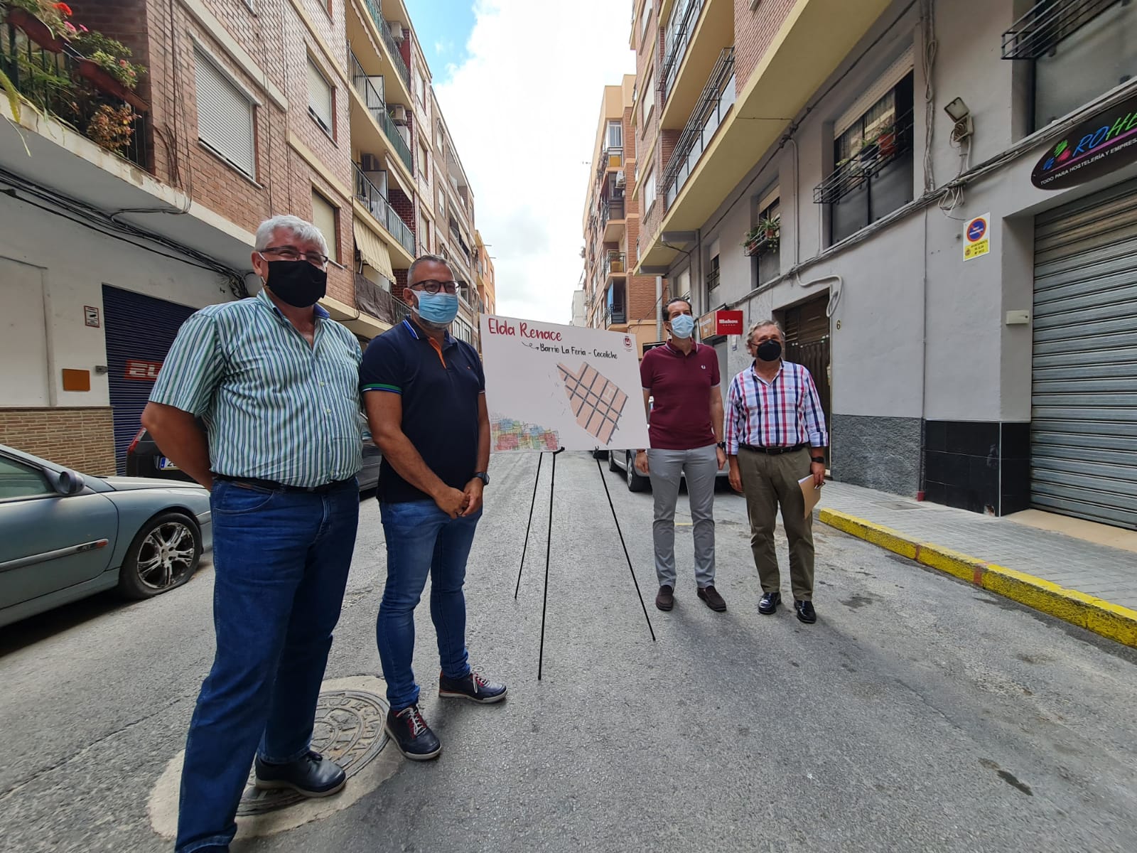 El alcalde de Elda, Rubén Alfaro, ha presentado hoy el proyecto de reurbanización del barrio de La Feria-Cocoliche, una inversión incluida en el Plan Elda Renace. El regidor eldense ha estado acompañado por el concejal de Servicios Públicos Sostenibles e Inversiones, José Antonio Amat; el ingeniero municipal Francisco Bellot; y Sergio Torregrosa, ingeniero técnico de obras públicas que ha realizado el proyecto.
