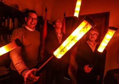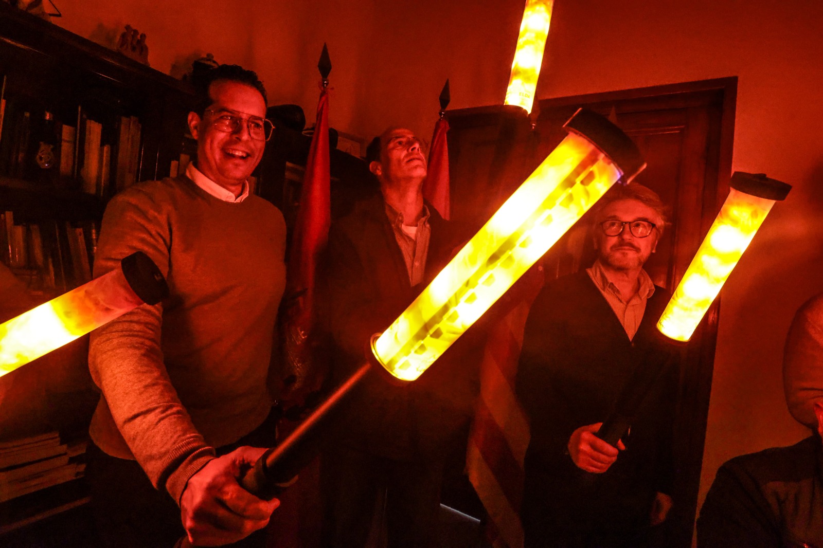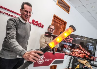 El alcalde de Elda, Rubén Alfaro, ha presentado esta mañana las nuevas antorchas LED que portarán los montañeros y montañeras el próximo 5 de enero durante la Bajada de Bolón y la Cabalgata de Reyes Magos. El regidor eldense ha estado acompañado por el concejal de Fiestas, David Guardiola; el presidente del Centro Excursionista Eldense, Rogelio García; el presidente de AMFI, Andrés Molina; y los profesores de Automoción del IES Canastell de San Vicente, Matías Sánchez y Carlos Hernández.