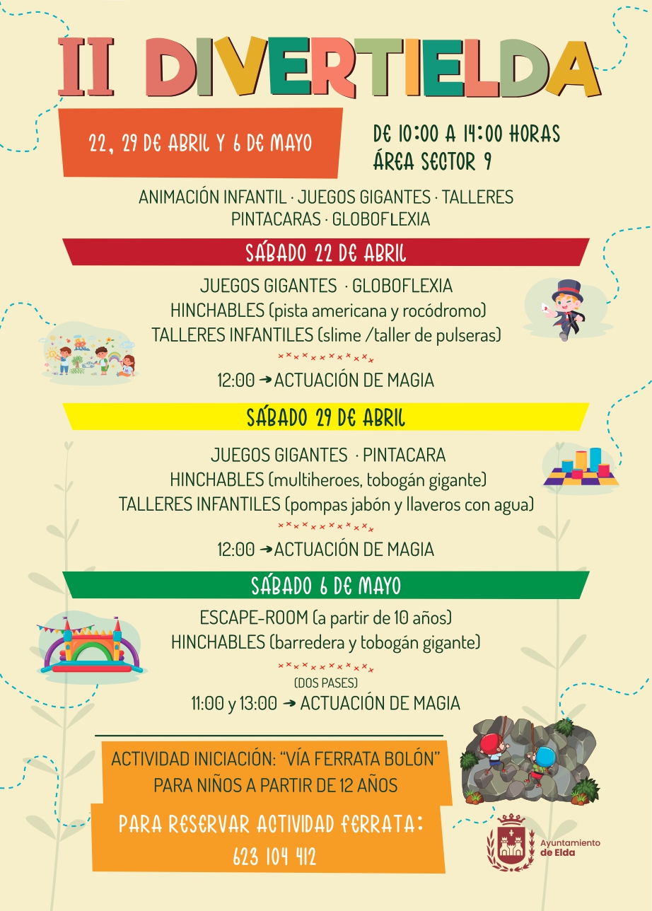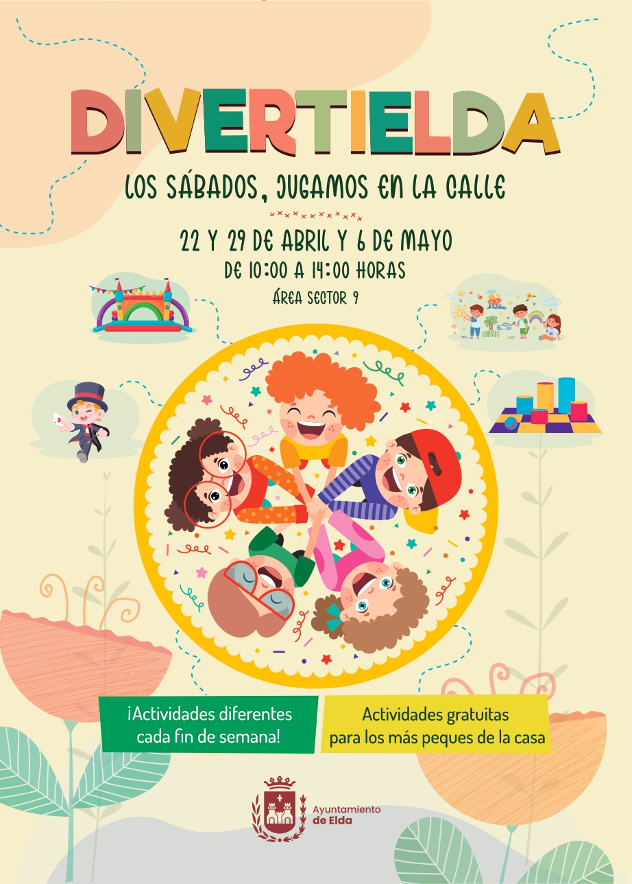 DivertiElda se desarrollará los sábados 22 y 29 de abril y 6 de mayo en el Sector 9, aunque está dirigida a todas las familias de Elda, e incluye un amplio programa de actividades gratuitas dirigidas a los más pequeños con el fin de que puedan divertirse de una manera didáctica y en compañía de sus familias.