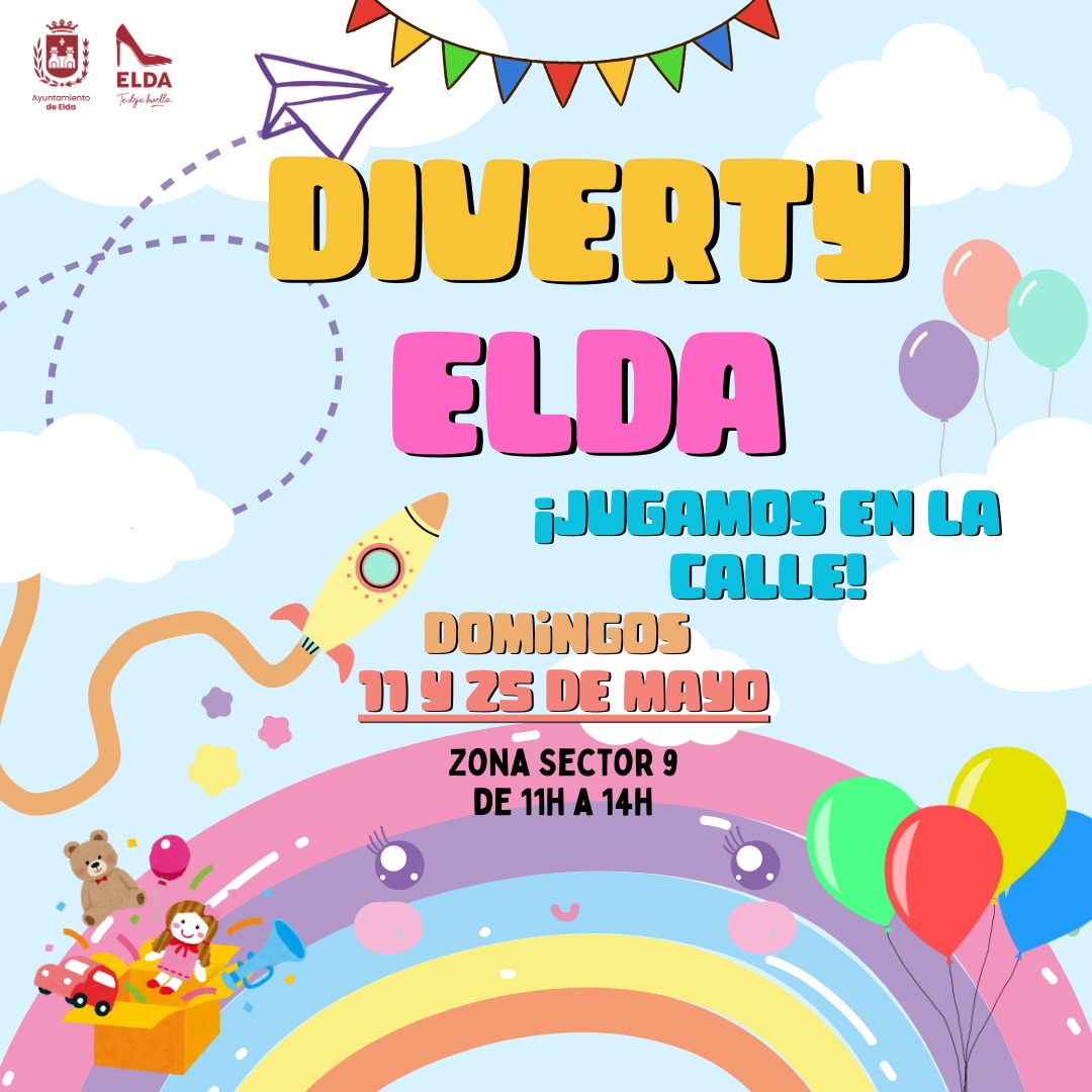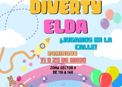 DivertiElda se desarrollará los domingos 11 y 25 de mayo en el Sector 9, aunque está dirigida a todas las familias de Elda, e incluye un amplio programa de actividades gratuitas pensadas para los más pequeños con el fin de que puedan divertirse de una manera didáctica y en compañía de sus familias.