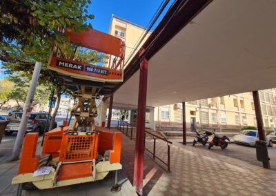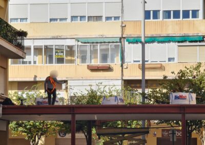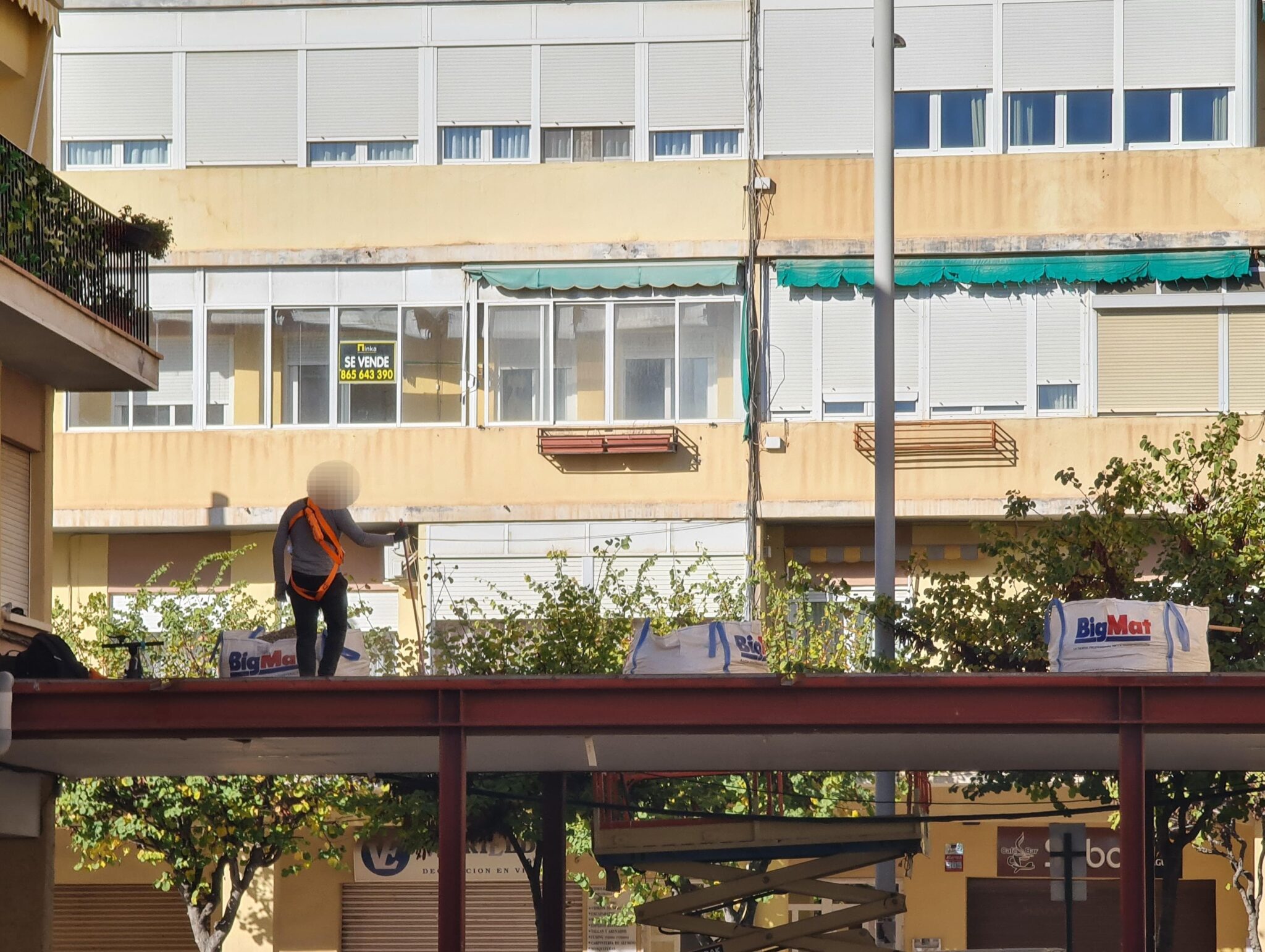De ese modo, se está procediendo a la retirada de la grava existente para instalar una lámina impermeabilizante que sirva para evitar la filtración del agua hasta el techado de la pasarela, y después se llevarán a cabo diferentes trabajos de lijado de paramentos para limpiar la pintura existente y aplicar un nuevo tratamiento de pintura pétrea compuesta por resinas de polimerización acrílica. Además, la estructura metálica también será repintada y se colocarán nuevas bajantes de pvc encargadas de extraer el agua de la pasarela hacia el exterior, evitando la acumulación y filtración del agua y la proliferación de nuevas humedades.
