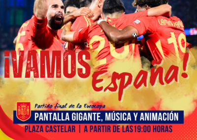 La pantalla de grandes dimensiones, a través de la cual se retransmitirá la final, se ubicará en la Plaza Castelar. Aunque el partido dará comienzo a las nueve de la noche, la fiesta arrancará dos horas antes con una ‘Fan Zone’ en la que habrá música y animación para que la afición de La Roja pueda vivir con pasión el encuentro.