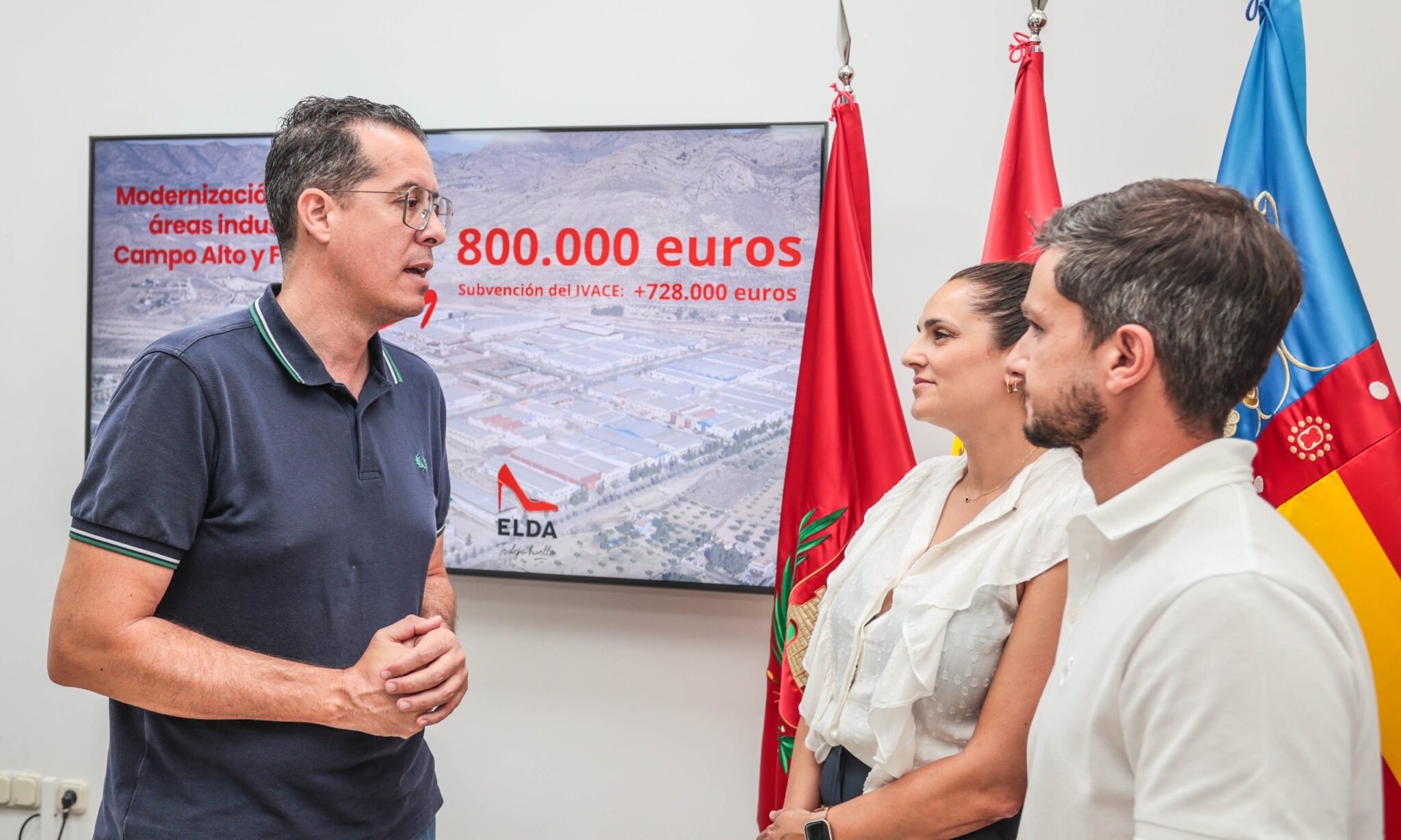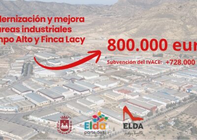 El alcalde de Elda, Rubén Alfaro, acompañado de Raquel Fernández, directora del área de Espacio Público e Inversiones y Marc Pastor, ingeniero municipal, ha anunciado que el Ayuntamiento de Elda ha logrado obtener una subvención del IVACE (Instituto Valenciano de Competitividad Empresarial) por valor de 728.812,51 euros, a la que añadirá 71.187,49 euros de recursos propios, para modernizar y mejorar los polígonos industriales de Campo Alto y Finca Lacy, siguiendo la senda marcada en años anteriores para continuar poniendo en valor estos enclaves empresariales tan importantes para la ciudad. De ese modo, la inversión en ambos espacios industriales alcanzará los 800.000 euros.