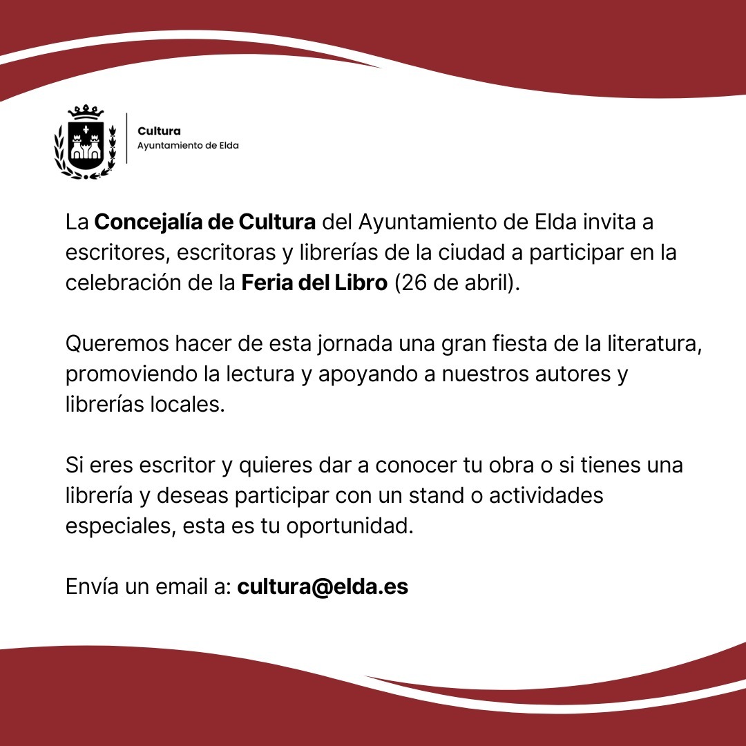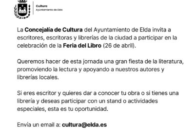 Desde la Concejalía de Cultura animan a los escritores y escritoras que deseen dar a conocer su obra y a las librerías interesadas en participar a sumarse a la feria. Para ello, pueden ponerse en contacto a través del correo electrónico cultura@elda.es.