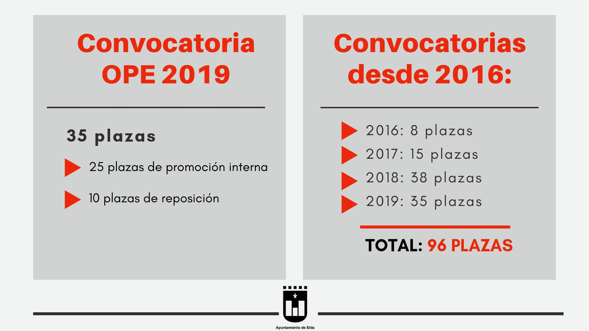 Asimismo, en los últimos cuatro años, y sumando estas 35 nuevas plazas, se han ofertados un total de 96 plazas dentro del Ayuntamiento de Elda: 8 en 2016, 15 en 2017, 38 en 2018 y 35 en 2019.