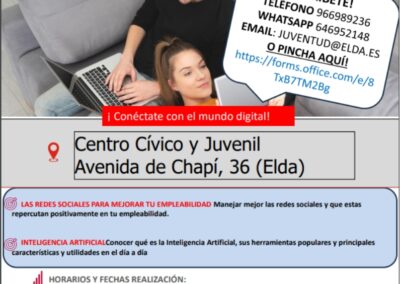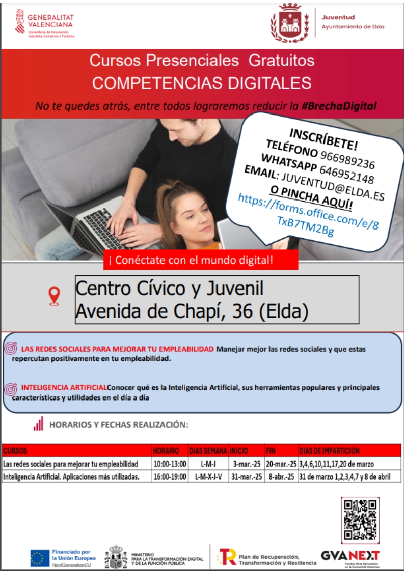 El Ayuntamiento de Elda, a través de la Concejalía de Juventud y en colaboración con Addeco, ofrece dos cursos presenciales de carácter gratuito sobre competencias digitales. El objetivo de esta formación, que tendrá lugar del 3 de marzo al 8 de abril en el Centro Cívico y Juvenil, es reducir la brecha digital y mejorar la empleabilidad de las y los jóvenes de Elda facilitando herramientas y conocimientos en redes sociales y en Inteligencia Artificial.