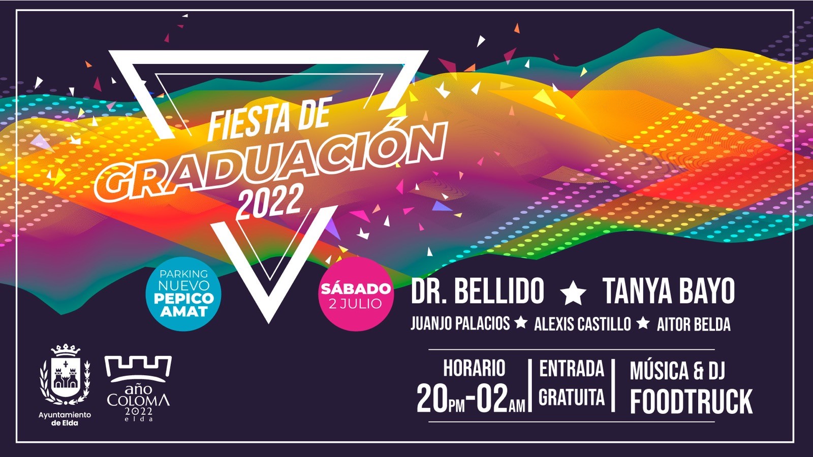 El Ayuntamiento de Elda, a través de las concejalías de Fiestas y de Juventud, organizará el próximo sábado, 2 de julio, la Fiesta de Graduación, una actividad de carácter gratuito, que comenzará a las 20.00 horas y finalizará a las 02.00 horas, dirigida a los y las jóvenes de la ciudad como motivo de la graduación del alumnos de los centros educativos eldenses.