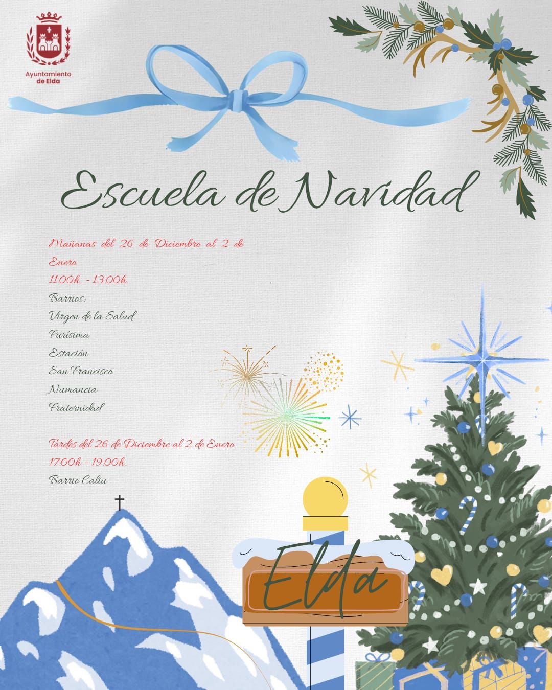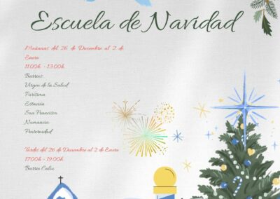 Las Escuelas de Navidad comenzarán el 26 de diciembre y se prolongarán hasta el 2 de enero en diferentes barrios con el objetivo de acercar los recursos municipales a todos los vecinos y vecinas. Las actividades se desarrollarán en dos franjas horarias: de 11:00 a 13:00 horas y de 17:00 a 19:00 horas. Por la mañana se llevarán a cabo en los barrios de La Purísima, Numancia, Fraternidad, La Estación, San Francisco y Virgen de la Salud, y por la tarde en Caliu.