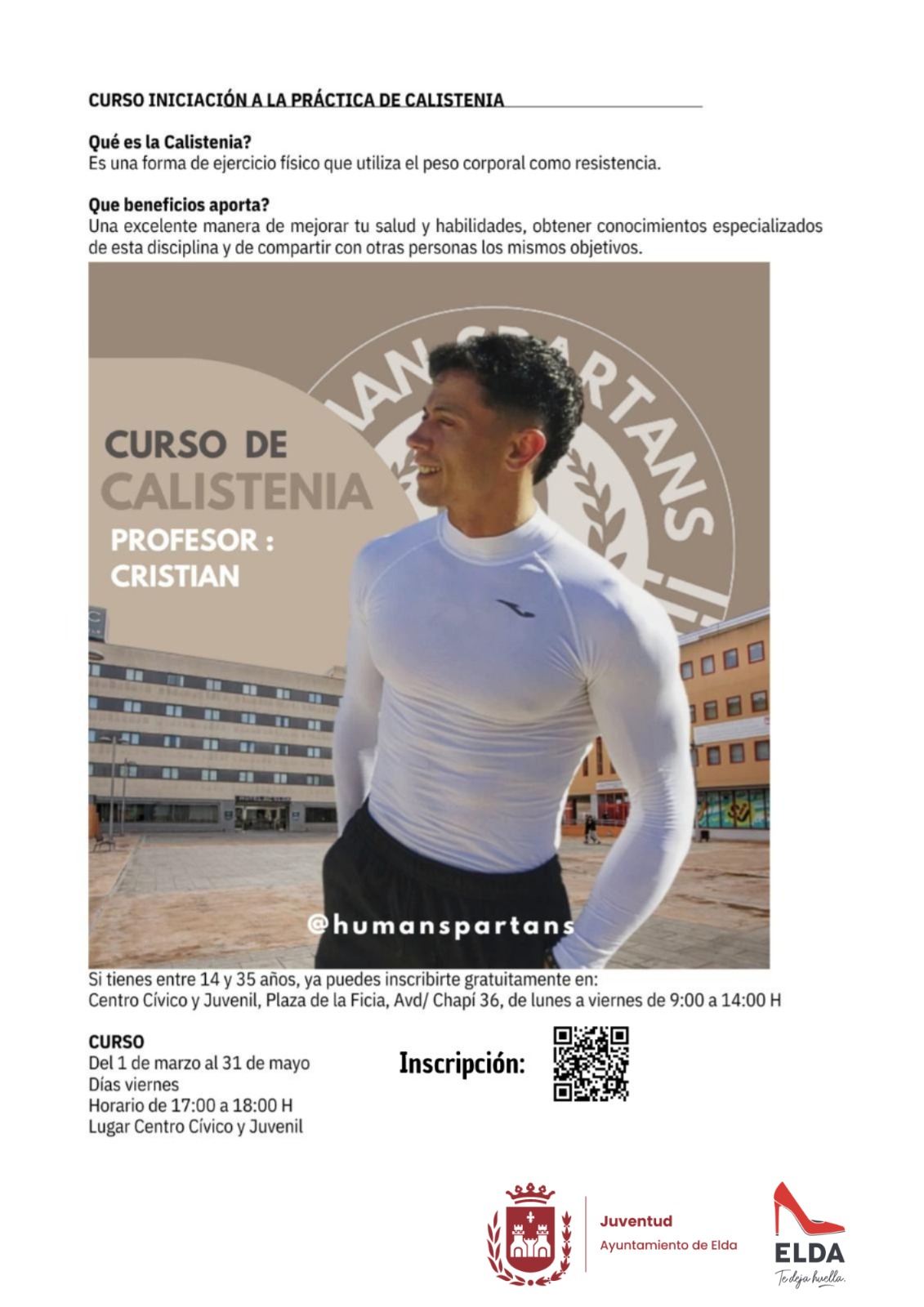 El Ayuntamiento de Elda, a través de la Concejalía de Juventud, ha puesto en marcha un taller de calistenia y un curso de inglés oral dirigido a jóvenes eldenses de entre 14 y 35 años. La concejala del área, Anabel García, ha explicado que estas dos actividades dan respuesta «a una demanda que recogimos en las encuestas y cuestionarios que se realizaron durante la elaboración del Plan de Juventud».