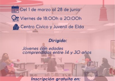 Previamente, ha explicado Anabel García, «se realizará un evento de captación que se desarrollará los viernes del 1 de marzo al 31 de mayo, de 17.00 a 18.00 horas en el Centro Cívico y Juvenil. La inscripción es gratuita y se puede realizar a partir de hoy, de 9.00 a 14.00 horas en el Centro Cívico y Juvenil y por teléfono (966 989 236)».