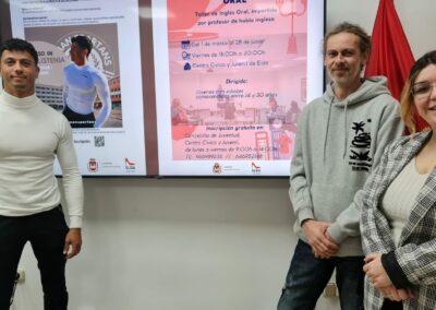 Además, la concejala de Juventud también ha anunciado la celebración de un taller de inglés oral «porque, aunque los idiomas se aprenden en la escuela y en las academias, hay una necesidad de ofrecer formación de oratoria para todos los y las jóvenes que quieran acceder a este curso de manera gratuita».