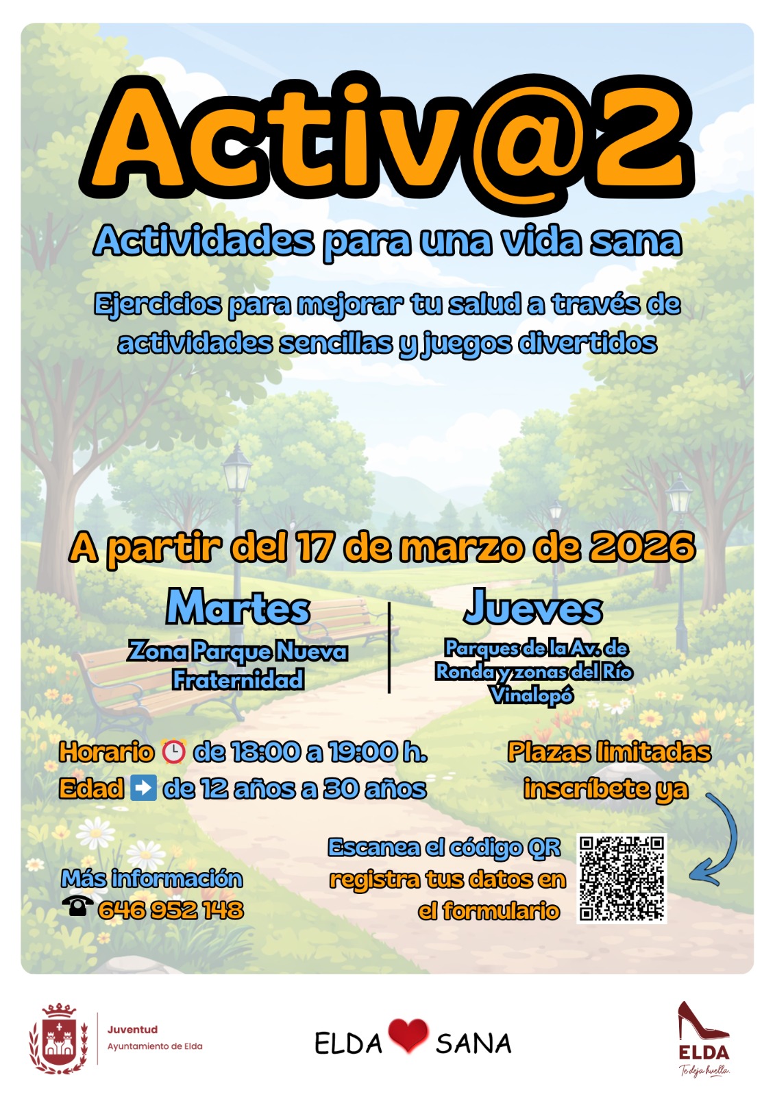 ‘Activ@2’ está dirigido a jóvenes con edades comprendidas entre los 12 y los 30 años. Las plazas son limitadas y la inscripción es gratuita, pudiendo realizarse a través del siguiente enlace: https://forms.gle/QEW2QkUZTnLRFFfr9
