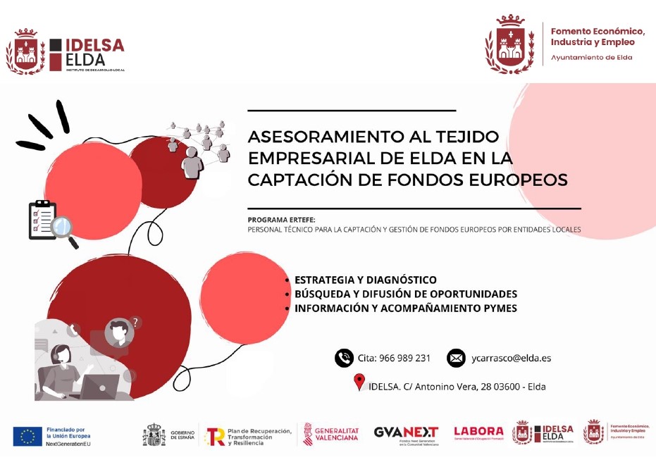 El Ayuntamiento de Elda, a través del Instituto de Desarrollo Local (IDELSA), ha puesto en marcha un servicio de asesoramiento para el tejido empresarial eldense en la captación de fondos europeos. Así lo ha anunciado hoy la concejala de Fomento Económico, Industria y Empleo, Silvia Ibáñez, quien ha explicado que “la puesta en marcha de este servicio es una de las principales actuaciones que se van a llevar a cabo desde Idelsa centro del Programa ERTEFE 2023”.