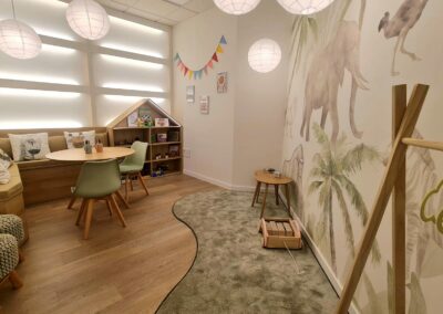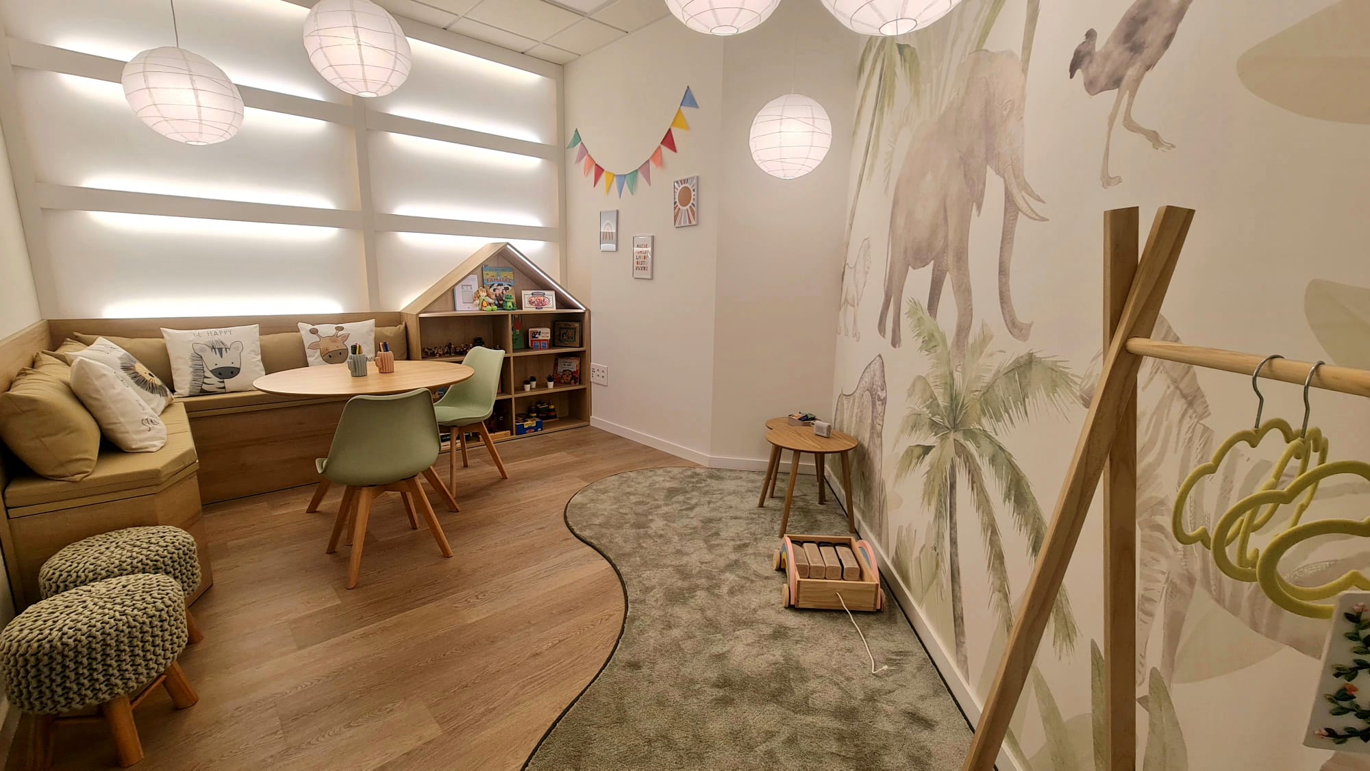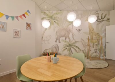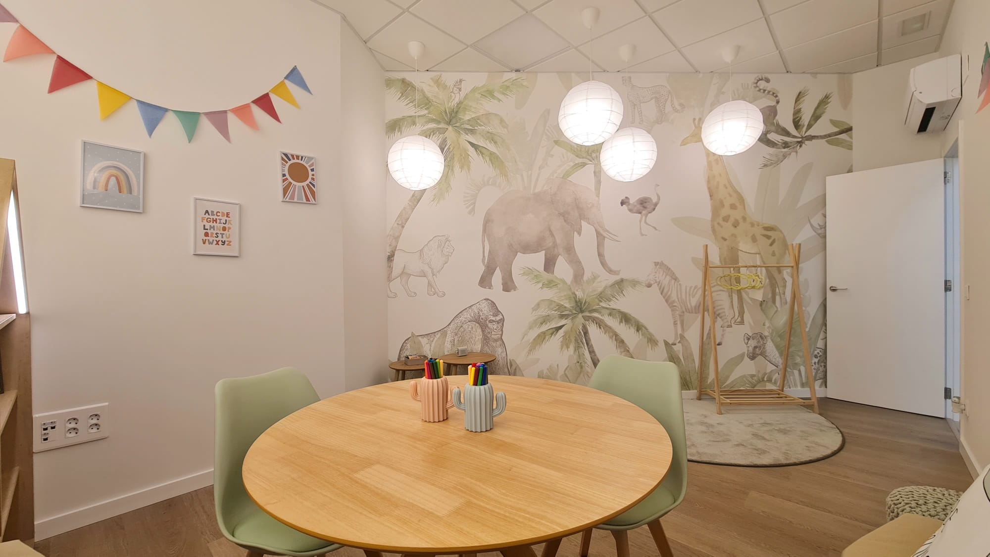 La decoración de esta sala se ha realizado empleando mobiliario cómodo y seguro y utilizando colores suaves para crear un ambiente cálido. La sala cuenta con pizarras, juegos de mesa y juguetes.